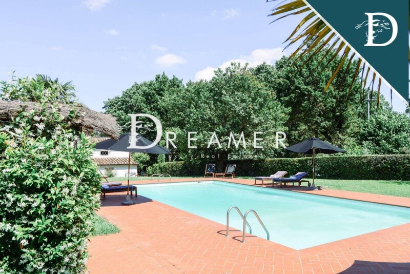 Historic villa with swimming pool for sale on the hills of Lucca, a few minutes from the city center and just 30 minutes from the Versilia coast. Consisting of three main buildings, the property boasts a distinctive villa distributed over 3 levels for a total of 765 sqm, a carefully restored farmhouse of approximately 430 sqm completed by an adjacent private chapel of approximately 64 sqm and a further annex of 223 sqm, currently used as a warehouse. The main structure is distributed over 3 floors. On the ground floor it features a spacious living area with lounge, kitchen, dining room, laundry room and billiard room. The sleeping area consists of 3 bedrooms and 2 bathrooms. The first floor opens with a spacious living room, with 3 bedrooms and 2 bathrooms. The second floor houses a large habitable attic complete with wood-burning oven and offers great potential for additional spaces. Finally, the basement houses a 250 sqm cellar to be renovated. The farmhouse, on 2 levels, has recently undergone a refined renovation. On the ground floor there is a spacious double living room, a large kitchen with direct access to the courtyard and rear garden, a bedroom with bathroom, a laundry room and a garage. The upper floor houses the sleeping area consisting of 5 bedrooms and 3 bathrooms. Adjacent to the farmhouse there is a private chapel decorated with wonderful frescoes. Outside, a garden houses the swimming pool, surrounded by 5 hectares of land. In this space there are also: an ancient park with centuries-old trees, an operational olive grove and a flourishing vineyard. The meticulously maintained garden in front of the villa offers panoramic views of the surrounding vineyards, creating an enchanting atmosphere for moments of relaxation and leisure.