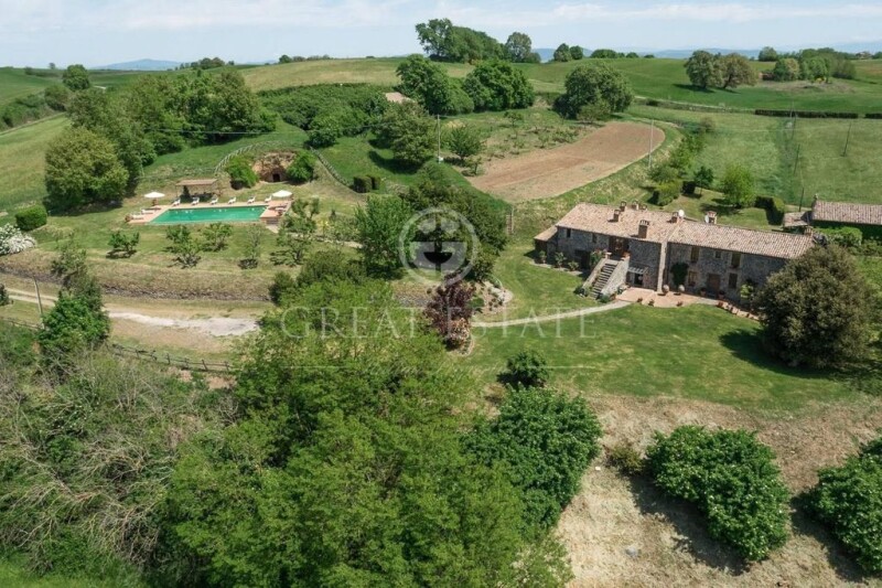 "La Vecchia Mangiatoia" is a beautiful property halfway between Orvieto and Lake Bolsena. It consists of a typical stone farmhouse of 450 sqm., an annex used as a warehouse of 77sqm, shed of 56sqm., a rural building with cellar of 30sqm., as well as buildable volumes and numerous caves excavated in the tuff. The exterior is made of a typical stone of the area, interior with terracotta, wooden beams and bricks. Recovery of typical and rural elements such as the old manger, the old oven and fireplaces. Used as a farmhouse with seasonal rentals in demand in the area. The panorama of the verdant hills of Umbria, Lazio and Tuscany that surrounds it with its suggestive evening sunset is beautiful. Most of the furnishings are included in the sale. Beautiful property halfway between Orvieto and Lake Bolsena with a typical farmhouse in stone, terracotta, wooden beams and where typical and rural elements such as the old manger and the old oven have been recovered. The pool is well lit and has an infinity edge, measuring 7 by 14 meters and 1.3-2.3m deep with a terracotta solarium. The main farmhouse is 450 sqm. Ground floor with: a large dining room with the old and suggestive manger, a large well-equipped kitchen with fireplace, dining area, another living room with antique fireplace, a double bedroom with bathroom and Jacuzzi; entrance/study and bathroom. The first floor has a large living room with satellite TV and fireplace, a double bedroom with independent study, access to the balcony and bathroom with tub and shower, a double bedroom with bathroom with hydro-massage shower, and bathtub, 2 bedrooms with bathroom with hydro-massage shower. Various entrances can make the areas independent and create apartments. The basement has a laundry room and a renovated room for bicycle/gym storage. Detached from the farmhouse: annexed warehouse of 77sqm, former barn roof of 56sqm, rural building with 30sqm cellar, as well as building volumes and numerous caves dug into the tuff. Land of 7 hectares with arable land of over 4 hectares + small orchard with former vineyard for hazelnuts, green area: a vegetable garden and completely fenced garden (about 2 hectares). Former barn shed in front of the house, large porch with tables and chairs, ideal for outdoor dining, and a second smaller porch with portable barbecue and old oven for making bread and pizza. Large parking area for events and catering. The panorama of the verdant hills of Umbria, Lazio, and Tuscany that surrounds it is beautiful. The caves dug into the tuff which if recovered, would become laboratories, cellars or small spas. Excellent personal residence, the potential for rentals or farm with hazelnut grove. Most of the furnishings are included in the sale. State of repair The main farmhouse is habitable with large spaces and colors accents, thanks to the latest renovation that was focused on the choice of excellent materials and systems of efficiency and functionality. Stone exterior typical of the area, interior with handmade and recycled terracotta, wooden and brick beams, ancient doors, and handcrafted elements. Recovery of typical and rural elements such as the old manger, the old oven, and fireplaces. Large rooms, bright, typical and elegant with ample space and space available. Well-maintained and cultivated land with very productive and pleasant arable land/pasture that sways over the surrounding valleys and the hilly profile. Utilities All utilities are present: one / three-phase power line, LPG gas with very recent boiler and storage; WI-FI internet, Municipal water network with drinking water to be used for the home and cistern or for outdoor use of the park. There is an alarm system. Thanks to the magnificent East-South-West exposure, it is possible to install photovoltaic systems for the production of electricity to ensure greater independence and sustainability of the property. Use and Potential Uses A pretty, but above all, functional home for those who need space and comfort. A spot for holidays that allows you to visit Umbria, nearby Tuscany and Lazio but also a permanent, comfortable and rational villa. Suitable for those who love complete privacy, being surrounded by greenery and well sheltered from prying eyes. Possibility of being divided into several units and enhanced as an accommodation facility, thanks to the presence of numerous annexes. The property is an oasis of calm and tranquility. It enjoys excellent privacy and an ideal place for those who love nature. Suggestive caves. Location In the green heart of Umbria, 15 km from Orvieto and Bolsena Lake, 12 km from the renowned "Civita city that dies" in Bagnoregio and 2 km from the village of Torre San Severo, we find the property. The house is accessed via 900 meters of well-maintained dirt road. Within a few km Montefiascone and Viterbo, 42 km Sorano (thermal waters), 72 km Montalto di Castro (beaches and sea), with just over 1 hour: Todi, Assisi, Perugia, Cetona and San Casciano. Highway and railway Rome-Florence 15 minutes by car. Airports 90 minutes away. Land registry details The Great Estate Group carries out technical due diligence on each property purchased, through the sales client's technician, which allows us to know in detail the urban and cadastral situation of each property. This due diligence may be requested by the customer at the time of real interest in the property. Ownership details and eventual contractual obligations The property is owned by a company.