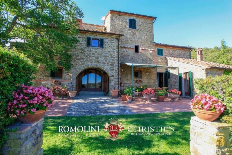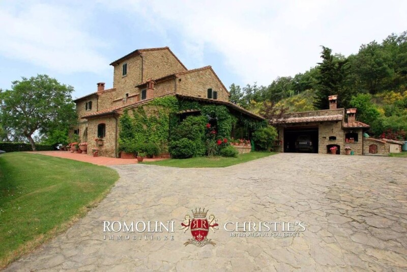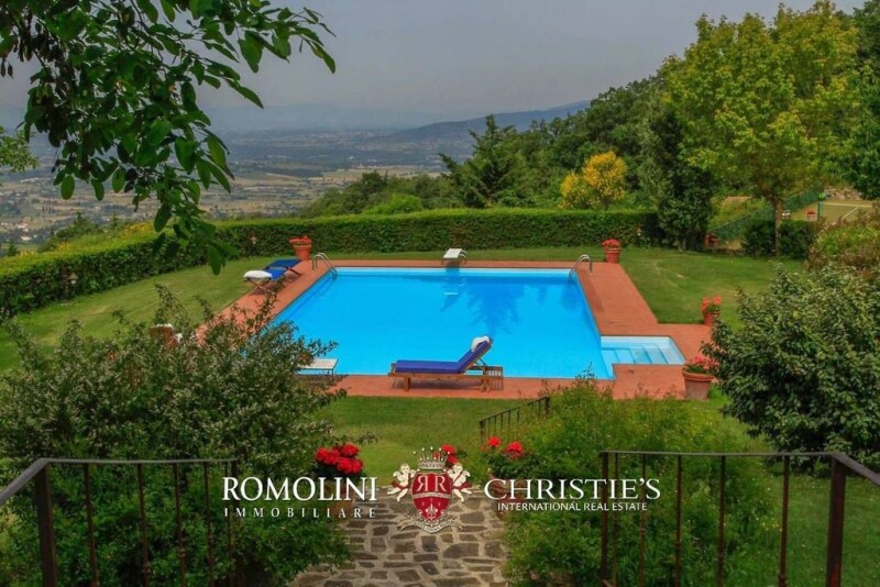 On the beautiful hills of the Tuscan countryside, in the vicinity of Arezzo, country house in panoramic position with swimming pool, dependance, olive grove and tennis court. With all the services available in the nearby center (10km; 5’), this beautiful country house is easily reached via a well-maintained paved road and grants a high level of privacy. The excellent linkage to the municipal road network allows a fast travel to the most renowned towns of Tuscany and Umbria: the Etruscan Cortona (38km; 1h), the wine-city of Montepulciano (60km; 1h 5’), the papal Pienza (67km; 1h 15’), the Reinaissance Firenze (83km; 1h 20’), the other wine-city of Montalcino (87km; 1 h 30’), the medieval Siena (80km; 1h 25), the Franciscan Assisi (116km; 1h 40’), Orvieto with its beautiful Duomo (117km; 1h 30’), San Gimignano with its imposing towers (126km; 1h 45’) and the medieval Todi (140km; 1h 50’). Useful airports are Firenze Peretola (99km; 1h 20’), Perugia Sant’Egidio (100km; 1h 30’), Bologna Marconi (183km; 2h 10’), Ancona Falconara (204km; 2h 40’), Roma Ciampino (238km; 2h 30’) and Roma Fiumicino (253km; 2h 40’). DESCRIPTION OF THE BUILDINGS The property is made up of two main buildings, plus a small tool shed. The country house (480 sqm – 5,165 sqft) is laid out onto three floors and organized as follows: - Ground floor: living room, dining room, kitchen, cellar, laundry. Separated from the residence, but still on the ground floor, there is also a garage. - First floors: accessed either via an internal staircase or directly from the outside, this floor is made up of a reading room, double bedroom with walk-in closet, en-suite bathroom and terrace, and a double bedroom with en-suite bathroom. - Second floor: accessed via a staircase departing from the reading room on the first floor, the turret of the property is entirely occupied by a bedroom with bathroom and terrace. The dependance (50 sqm – 528 sqft) is laid out onto two floors and located just next to the main country house. STATE AND FINISHES The property has been finely restored, preserving those typical traits of Tuscan country houses. On the outside we can see beautiful exposed stone walls, with the building surrounded by a terracotta and stone tiled walkway. On the inside, we can find a nice mix of parquet and terracotta tiles, disposed in geometric patterns, while roofs are supported by wooden beams. Finally, we can find some beautiful stone fireplaces and high-quality wooden fixtures. EXTERIOR On the outside the property is surrounded by 5 hectares of land, mainly covered in woods. Right around the building we can find a beautiful and well-maintained garden with a rectangular 15 x 8 m swimming pool fitted with a nice terracotta solarium. The pool grants a beautiful view over the surrounding nature. The real gem of the property, however, is the synthetic tennis court located just below the pool, on a dedicated terrace, which grants the possibility to keep fit in the beautiful Tuscan countryside. Last but not least, the property comes with 200 olive trees which can easily be exploited to produce enough oil for a whole family. USE AND POTENTIAL USES The property is in excellent conditions and thus usable right-away. The presence of 4 bedrooms and a dependance allows the starting of a hosting activity without any problem, given also the presence of a pool and a tennis court which could grant a nice diversion for guests. In alternative, thanks to the excellent level of privacy granted by the position, it is always possible to use the property as a private residence. CLOSEST CITIES AND TOWN†S Arezzo (10km; 5’), Cortona (38km; 1h), Montepulciano (60km; 1h 5’), Pienza (67km; 1h 15’), Firenze (83km; 1h 20’), Montalcino (87km; 1 h 30’), Siena (80km; 1h 25), Gubbio (99km; 1h 35’), Perugia (102km; 1 h 30’), Assisi (116km; 1h 40’), Orvieto (117km; 1h 30’), San Gimignano (126km; 1h 45’), Todi (140km; 1h 50’) CLOSEST AIRPORTS Firenze Peretola (99km; 1h 20’), Perugia Sant’Egidio (100km; 1h 30’), Bologna Marconi (183km; 2h 10’), Ancona Falconara (204km; 2h 40’), Roma Ciampino (238km; 2h 30’), Roma Fiumicino (253km; 2h 40’).