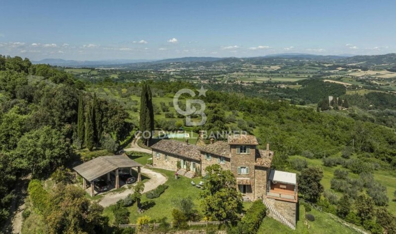 A short distance from Todi, immersed in the tranquility of the Umbrian countryside, this splendid historic residence stands majestically like a queen. Its dominant position embraces vast horizons offering an unparalleled panoramic view. COMPOSITION This ancient farmhouse, dating back to 1800 and renovated at the beginning of the 90s, is spread over three levels and covers a total area of approximately 500 m2. Consisting of three autonomous and independent living units, it offers a large and harmonious distribution of internal spaces. The first unit, composed of a kitchen with fireplace and panoramic terrace, dining area with small balcony, 3 double bedrooms, study and bathroom, enjoys access to the panoramic tower, the highest area of the property. This privileged point which offers a 360 degree view, lends itself perfectly as an intimate and evocative refuge for romantic dreamers or artists looking for inspiration. The second house is instead composed of a large living room, kitchen with fireplace, bathroom with shower and a second living area which enjoys the presence of a pleasant external porch perfectly integrated into the architecture of the structure. The sleeping area is made up of 2 double bedrooms and a bathroom. The third apartment, consisting of a large and bright living room, kitchen with fireplace, three double bedrooms, one with an en-suite bathroom and a second bathroom serving the sleeping area, directly overlooks the private external courtyard. OUTDOOR SPACES The property enjoys a large outdoor garden of approximately 5000 m2 and approximately 33 hectares of surrounding land, which, thanks to its large extension and the presence of lush vegetation, guarantees a high level of privacy and tranquility. The structure is enriched by a beautiful swimming pool perfectly integrated into the natural context of the farmhouse, which offers an exclusive and relaxing atmosphere. USE AND POTENTIALITY If you are looking for a place that makes you feel on top of the world and wonderful landscapes to contemplate, you have found the perfect property for you. The charm of this residence that reigns supreme is undeniable and surprises anyone who observes it. Here, you will have the opportunity to experience deep emotions in close connection with the magnificence of nature and life. Being divided into three independent housing units, the structure of the farmhouse offers a versatile and functional solution. Ideal both as a multiple family residence and for short or even long-term tourist rentals. The subdivision of the structure, combined with the presence of common spaces, such as the garden and the swimming pool, offers a perfect balance between privacy and conviviality, making it extremely versatile and suitable for different needs and lifestyles. DISTANCES Immersed in the green heart of Italy, Todi boasts a privileged position being just a few kilometers from the main cities of.