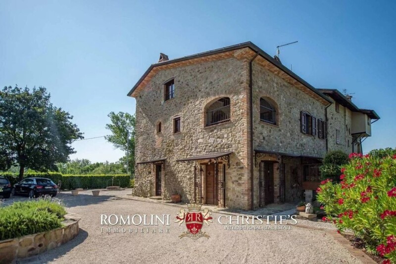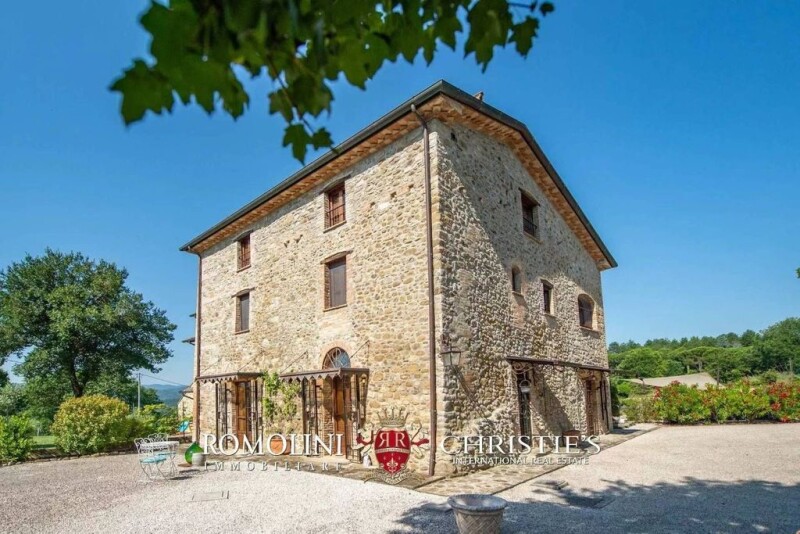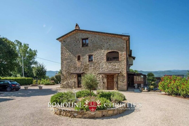 In the Umbrian countryside, not far from Città di Castello, semi-detached farmhouse with garden for sale. The building has been finely restored and retains much of its rustic character, currently offering 4 rooms with the possibility of creating a fifth. The 2,550-sqm garden surrounding the house accommodates a pergola, a paved patio with Jacuzzi and a convenient parking area for cars. Basic services are available in the nearby town (4 km; 5’), while Città di Castello has all amenities including shopping centers, hospital, shops and banks. However, the location is close to the border between Umbria and Tuscany and in less than two hours you can reach all the art cities of both regions, including Perugia, Montepulciano, Pienza, Florence and Siena. DESCRIPTION OF THE BUILDINGS The farmhouse (258 sqm – 2,776 sqft, 4 bedrooms and 5 bathrooms) is a typical stone building, renovated in recent years and arranged on three floors. From the courtyard one enters the farmhouse directly in the spacious living room with fireplace, connected to the dining area by an archway and then to the kitchen. On the same floor, a secondary entrance joins the living room and leads to the service bathroom. The staircase from the living area rises to the first floor: here the central hallway leads to two bedrooms with en-suite bathrooms and a private office space (potentially fifth bedroom) with two panoramic windows overlooking the surrounding countryside. Back to the staircase, one goes up again to the second floor where are two more bedrooms with private bathroom and a wardrobe. The renovation of the building aimed at preserving the salient features of the farmhouse, which therefore largely retains its original appearance with thick stone walls, terracotta floors, wooden beams with terracotta tiles on the ceilings and the original fireplace in the ground floor living room. EXTERIORS The farmhouse is surrounded by a convenient gravel courtyard, which is also very convenient as a parking area, and by a lovely well-kept garden that can be reached via a short tree-lined avenue from the co-municipal road. The land belonging to the farmhouse, which is fenced off, measures a total of approx. 2,550 sqm. On one side of the building there is a comfortable pergola equipped with table and chairs for outdoor dining and just beyond a paved square with a whirlpool bath for relaxing in the summer. CLOSEST CITIES AND TOWNS Town with services (4km; 5’), Monte Santa Maria Tiberina (13km; 20’), Città di Castello (14km; 15’), Umbertide (15km; 20’), Sansepolcro (31km; 30’), Cortona (34km; 55’), Anghiari (38km; 35’), Gubbio (46km; 50’), Perugia (48km; 45’), Perugia (48km; 45’), Castiglion del Lago (56km; 1h), Deruta (62km; 50’), Assisi (65km; 50’), Montepulciano (73km; 1h 20’), Pienza (78km; 1h 35’), Urbino (81km; 1h 40’), Todi (90km; 1h 10’), Spoleto (100km; 1h 15’), Siena (104km; 1h 40’), Orvieto (121km; 1h 45’), Florence (125km; 1h 55’), Lucca (206km; 2h 30’) CLOSEST AIRPORTS Perugia San Francesco (47km; 40’), Forlì L. Ridolfi (130km; 1h 50’), Firenze A. Vespucci (146km; 1h 55’), Rimini F. Fellini (161km; 2h 5’), Pisa G. Galilei (206km; 2h 35’), Bologna G. Marconi (206km; 2h 30’), Roma Ciampino (228km; 2h 35’), Roma Fiumicino (244km; 2h 45’),.