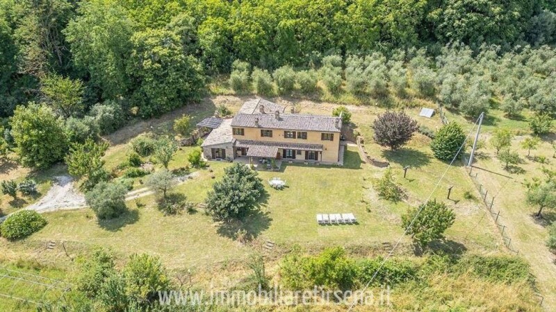 Umbria-Orvieto In a panoramic and sunny position, characteristic farmhouse perfectly restored with typical materials, in perfect condition on two floors for a total area of .370 square meters, which is accessed via a very short well-kept white road, less than 10 minutes walk from the Duomo of Orvieto and the funicular, without needing to use the car. The area where the property is located is still considered the historic center as it is just outside the city, a few steps from shops, coffered restaurants and less than an hour and fifteen minutes from Rome and just a 20-minute drive from Lake Bolsena. For those who love outdoors, there are numerous hiking paths and cycle paths accessible through the streets and vineyards that surround the property. The garden, completely fenced, is about one hectare, with numerous olive trees and fruit trees and enjoys a beautiful view of the green countryside and also of the Orvieto cliff, with its golden color, unique at sunset. The living space on the ground floor offers beautifully sunny and bright rooms, terracotta tiles and ceilings with wooden beams. The enchanting country kitchen is typically Umbrian with handmade furniture. a large glass door allows access directly onto the portico, used as another shady dining area thus extending the living space towards the exterior. Also on the ground floor there are two bedrooms (one with private bathroom) and another guest bathroom. Furthermore, the ground floor there is a sunny dining room / living room with windows overlooking the garden. Outside the living room there is a spacious porch with wood-burning oven, a well-equipped storage room. From the ground floor living room there is access to the first floor via a comfortable and well-finished staircase, or even from another entrance from the garden to the first floor so that each floor of the building has a private entrance also from the outside. The first floor has a double open plan living room with tiled fireplace and open plan library. From the living room there are 3 double bedrooms (two with private bathroom). There is also a large common bathroom for all rooms. The interiors, wonderful, are characterized by original tuff arches, solid hand-made interior doors and ceilings with wooden beams of chestnut trees and terracotta tiles, the rooms have been carefully decorated with restful colors that complete the refined combination of high quality furnishings and carefully selected antiques. The property is equipped with all amenities, with all perfectly working systems. The property is about 1 km away. from the train station and about 1.5 km. from the Rome-Milan motorway exit. Nearby: Bolsena and its cleanest volcano lake in Europe, Civita di Bagnoregio, Todi, Viterbo, the spas of San Casciano di Bathrooms and Chianciano. The coast of the Tyrrhenian Sea is just over an hour away.