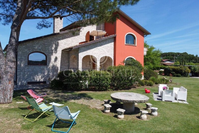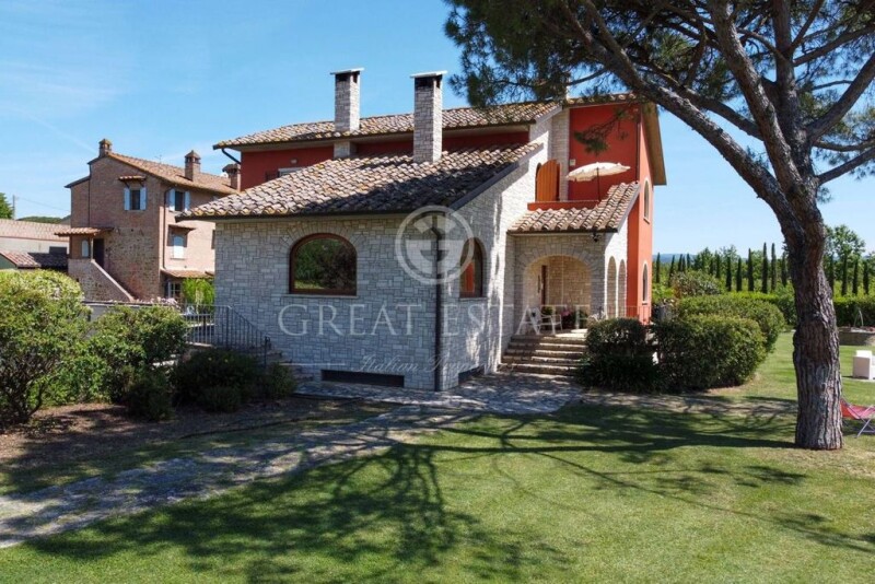 This beautiful villa is immersed in the green Umbrian countryside surrounding Lake Trasimeno and is arranged on 3 floors for a total of 420 square meters. The property is surrounded by a beautiful fenced-in garden of approximately 11,000 sqm and agricultural land of approximately 2 hectares. The recently built villa is arranged on 3 levels: two levels above ground and a basement. You enter the first level and immediately find yourself in front of a very large L-shaped open space; in the front there is the dining area, on the larger side the lounge area with a wonderful fireplace in the center. In front of the living area we find a large kitchen with a breakfast table, followed by a bedroom convertible into a study and a bathroom. From the living room you go up to the first level via a beautiful staircase that leads us to a gallery: here there are two bedrooms and a bathroom and a beautiful suite with bathroom and walk-in closet. In the basement served from the inside by a staircase we find a beautiful background with the same finishes as those present in the villa. Also on this level there is a laundry room, a basement and a bathroom. Next to this we have a large closed double garage. The villa is surrounded by a large and well-kept garden of approximately 11,000 sqm completely fenced-in, in the garden you can build a beautiful swimming pool. The property includes approximately 2 hectares of agricultural land. State of repair The facades are in stone and plaster, the floors of the living and sleeping areas in Doussiè wood, the stair railing in steel, the doors and windows in oak wood and the floors in the basement in porcelain stoneware. The garden includes a lighting system and an irrigation system. Utilities On the property there are all utilities connected: electricity to the national network, the water through the local network and there is also a well. The heating system is LPG gas and pellet. There is an air conditioning system, an intercom system, an alarm system. Use and Potential Uses The villa lends itself to being a manor property and possibly has excellent potential to be included in the tourist rental sector. Location The property is located a few steps from Lake Trasimeno, 5 minutes from the Perugia Bettolle Siena highway which at Bettolle crosses the A1 Milan Rome Naples motorway, 10 minutes from the Castiglione del lago and Terontola railway stations, 30 minutes from the airport of Perugia, 60 minutes from Florence airport. A few minutes away there are small villages of great cultural interest and some spa resorts. Land registry details The Great Estate group carries out a technical due diligence on each property acquired, through the seller's technician, which allows us to know in detail the urban and cadastral status of the property. This due diligence may be requested by the customer at the time of a real interest in the property.