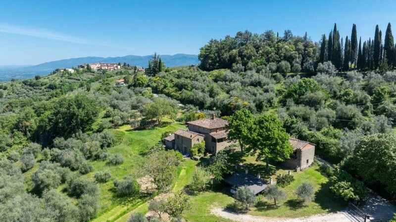Beautifully restored and brilliantly located property in the hills of the Valdarno. Dating from the 1700s, the property is immersed in nature and right in the centre of what is known as Tuscany’s ‘golden triangle’ of Arezzo, Siena and Florence, in the very heart of this stunning region. The property enjoys fine views of the hills of Chianti, total privacy, and tranquillity, yet it’s just a 10 minute walk to the village of Moncioni with its busy little shop/bar, boutique hotel and elegant restaurant. For a full range of shops and services, Thursday market and train station on the main Florence-Rome line, Montevarchi is a 10 minute drive. The Valdarno A1 motorway junction is 15 minutes away by car. The property, currently managed as an organic olive farm, consists of 12 acres of olive groves with 300 olive trees and another 12 acres of woods, mainly firs and chestnuts. The buildings comprise the house of 276 square metres, the partially restored 2-storey barn of 89 square metres, a free-standing bread oven and 4-car garage. The barn has a ventilated floor slab and all services connected so the ground floor just needs surface finishes. The house has an unusual layout as it follows the terraced line of the hill. An ample loggia on the south side offers very pretty views and shades the front door. There’s a study as one enters to the right, while to the left is a charming old kitchen with a huge working fireplace and a useful pantry. The dining room has a jib door which opens to reveal a ‘secret’ corridor to the western portion of the house currently let as a successful holiday cottage. Beyond the dining room is the sitting room, with glass doors opening to a back terrace. Between the study and the kitchen, old stone stairs lead to the upper floor with 3 bedrooms, 3 bathrooms and a laundry room. The luxurious master bedroom en suite has a walk in shower and a 2-person spa bath. The ground floor of the current guest cottage is accessed from a huge panoramic terrace to the west and offers a sitting room with fireplace, a dining room and a well equipped kitchen with a second door out to the terrace. Characterful open stairs lead to the first floor with a large bathroom and a double bedroom. Currently the guest cottage is entirely independent, but the two portions can be joined across the ‘secret’ corridor to form a single 4-bedroom house. Externally there is a storage room, a cellar and a woodshed. Water is supplied from a private well with 10,000 litre storage tank, mains water as backup if needed, and LPG provides hot water and heating inside the houses. There are 2 electricity supplies, 6kW 3-phase and 4.5kW monophase for the current guest house and air conditioning in 3 of the bedrooms, the main sitting room and the office. There is space for a swimming pool (please see picture gallery) and new owners would simply need to complete the application process according to their design preferences.