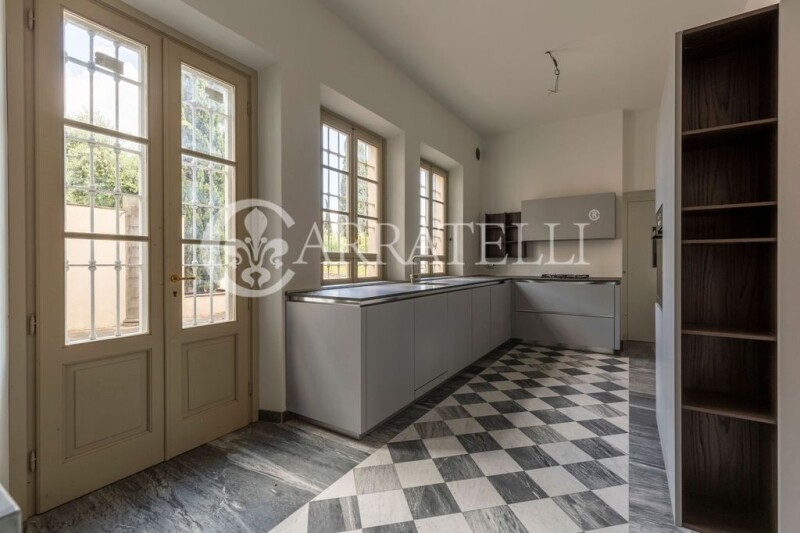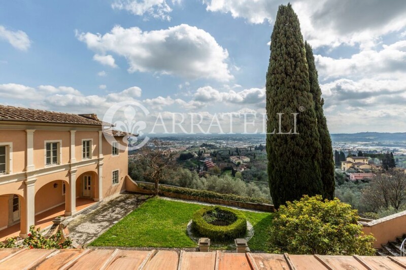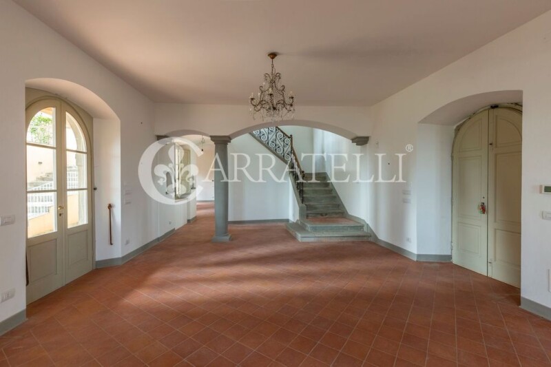 Exclusive historic home with chapel and garden, in a panoramic position in the heart of the Tuscan countryside in the hills between Lucca and Pistoia. Description The property, dating back to the 1700s, underwent a meticulous and total renovation completed in 2022. The entire complex, main villa, chapel and garden, constitute a significant example of the original 18th-century design of the classic and stately Lucca villa with garden. The historic villa is on three levels connected by an elevator and internal staircase, totaling 600 square meters. The entrance, on the ground floor, is directly into the large and bright living room with fireplace, paved in terracotta tiles and externally connected to the wonderful porch overlooking the garden and the fountain. Limitrofa to the living area, the spacious dining room also connected to the outdoor porch, the adjoining large marble kitchen with fireplace, a guest bathroom and a service area with technical room, utility room, an additional room with bathroom that could be used as an additional guest room. From the living room, via the original stone staircase, you go up to the second floor that houses the sleeping area completely floored in fine parquet flooring. This level consists of a bright study-library room overlooking the garden, master bedroom with panoramic views and equipped with wardrobe room and double bathroom, a convenient storage room and three additional bedrooms with en-suite bathrooms. With access directly from the street, the basement level contains the large three-car garage, a bathroom and several cellar rooms, all connected internally to the upper floors by elevator. Also on this level, facing the street, are some rooms to be used as independent apartment or accommodation for janitor or service personnel, consisting of living room with fireplace, kitchen, bedroom and bathroom. Outdoor Spaces In a dominant position, with panoramic views of the plain below, the villa enjoys the well-kept terraced outdoor garden of 2000 square meters with nymphaeum and decorated fountain, the still consecrated private chapel, additional outdoor parking spaces and an additional sloping plot of land after being able to build the swimming pool. Possibility to purchase additional hectares of land with olive groves and two renovated farmhouses divided into three units plus swimming pool. Condition and finishes The mansion has been elegantly restored with a salvage business and elegantly furnished. Potential uses Perfect as an exclusive luxury residence in the heart of Tuscany. Location Located in the Tuscan hills of Pescia, between Lucca and Pistoia, halfway between the main cities of Florence and Siena and the renowned seaside resorts of Versilia, within walking distance of all major services.