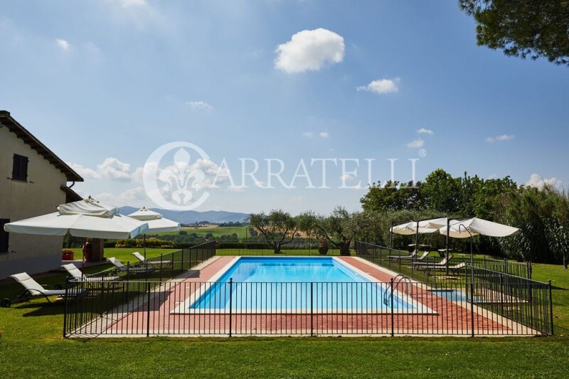 In an evocative landscape setting, immersed in the cultivated countryside of Umbria, we offer farmhouse with swimming pool in a private but not completely isolated position. Description The farmhouse measures a total of about 762 square meters and is spread over two levels. On the ground floor from the main door you enter a large triple living room with brick arches and a large fireplace and an oven. The dining room is directly connected to the professional kitchen with special storage for unloading products. A first bedroom with bathroom is then accessed. There are 2 other service bathrooms. On the first floor from a first staircase we find a bedroom with bathroom and a small living space, from another staircase instead we access a lovely sitting room with a beautiful arched window overlooking the garden and the countryside, in addition to the 6 bedrooms and 5 bathrooms, of these 2 bedrooms have en suite bathrooms. Outdoor Spaces The property includes a beautiful and well-kept garden, where the 15x6 swimming pool is also located and where the large porch of about 100 sqm overlooks, perfect for meals in summer. State and finishing touches The property was renovated in 2016 and is in perfect condition. A solar panel system was also installed in 2013. Water and electricity utilities are connected. Heating is autonomous and powered by LPG. Potential for use The property is currently rented out touristically to groups and for private events. It lends itself perfectly as a first or second home and can be put to income during summer periods. Location & Lifestyle The property is located in an area of absolute tranquility, in the town of castiglione del lago, reachable in just 8 minutes. Thanks to its centrality, from Castiglione del Lago it is possible to reach all the main towns and cities, such as Passignano sul Trasimeno, Tuoro sul Trasimeno, Perugia, Assisi and Magione. It is possible to reach Castiglione del Lago via the super road, which is connected to the A1 highway at Bettolle (Milan-Naples). Therefore, large cities such as Rome and Florence are also conveniently accessible.