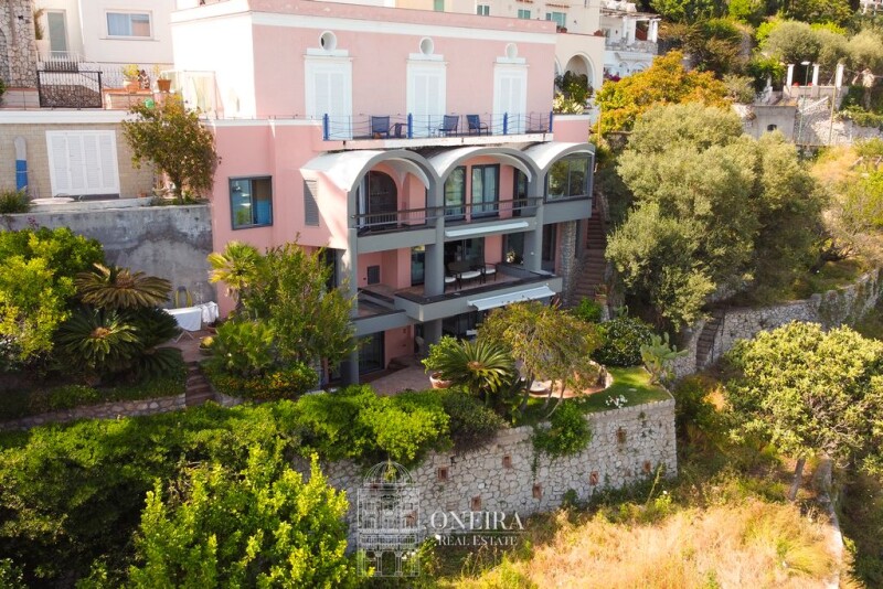 Luxurious Villa With Breathtaking Views Of The Faraglioni Nestled in the picturesque basin of Marina Piccola with a privileged exposure facing the famous Faraglioni, this luxurious villa offers a breathtaking view that embraces the entire bay. Its unique architectural design characterised by clean lines and minimalist geometric shapes lend a modern elegance and unique personality to the property, making it a gem of refined architectural taste. The main façade features large windows, which give it considerable internal luminosity. The villa is built on three levels, all designed to be projected towards the sea, offering spectacular views of the Faraglioni from every angle. Embellished with fine materials and a beautiful staircase that elegantly connects all three levels makes internal movement easy and refined within this impressive property. The first level, welcomes us with a large panoramic living area, three bedrooms with direct access to a large terrace, which connects all the rooms, two bathrooms and a kitchenette. The second level, consists of a living room area and an elegant study, which lead onto another spacious terrace with a view of the sea and the Faraglioni rocks, a bedroom, a bathroom and a storage room. Finally, the third level features a spacious living area with a dining area enhanced by exposed stone walls, a large kitchen and a bathroom. The exterior of this level is enriched by an elegant portico leading to a large outdoor area of 400 square metres, lush with Mediterranean vegetation. An avenue adorned with beautiful plants leads to the annexe, a comfortable independent solution consisting of a bedroom and a bathroom, ideal for guests or service personnel. This villa represents a rare and precious opportunity due to its unique location, spectacular views and distinctive design. The beauty of this villa lies not only in its refined interior and fine materials, but also in its privileged location that makes it an unparalleled jewel with the sea always within sight. Its structure and interior layout makes it versatile and ideal both as a private residence and as a high-level accommodation business.