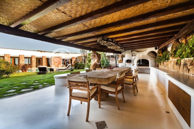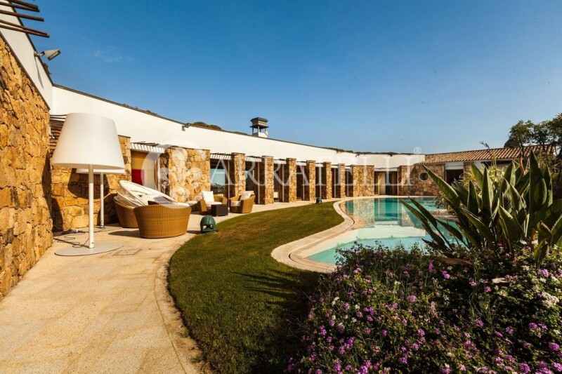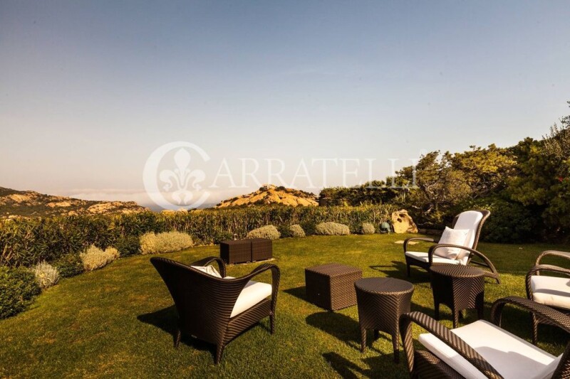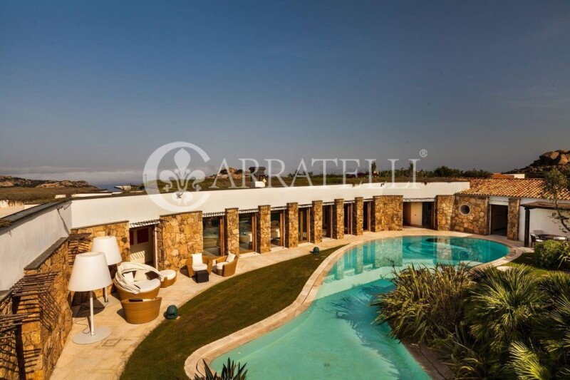 Prestigious independent Villa with splendid views of the Maddalena Archipelago, immersed in the Mediterranean scrub of the Miata hills, a few minutes from the Liscia di Vacca beach. LOCATION & LIFESTYLE The Villa was built according to a double concept, on the one hand it creates an area protected from the mistral wind, a sort of courtyard or internal courtyard where to place the large dolphin-shaped swimming pool and the large barbecue with outdoor dining. On the other, through large windows, both towards the sea and towards the courtyard. The architect Luca Scacchetti who designed this Villa, wanted to build a passing view to introduce the background of the Maddalena Archipelago, the sea and its view command the position of the Villa, together with the desire to create a private, reserved space and climatically protected. Description Villa Sa Contissa looks like a large hemicycle composed of different bodies that overlook the swimming pool and the internal space, unified by a series of stone partitions that frame full-height window openings. A linear architectural language that is perfectly inserted in the landscape and that is connected to the Sardinian and local tradition. The villa is composed as follows: entrance with large wardrobes, super-equipped kitchen, courtesy toilet, dining area, large living room with sea and pool view, sleeping area consisting of a master suite with walk-in closet and bathroom with Jacuzzi and shower with chromotherapy system. Three other double bedrooms with wardrobe and bathroom. The living room leads to the lower floor where there is the cinema-relaxation room equipped with a full-hd system and the fitness area with porthole immersed in the swimming pool, as well as the laundry room and the extra pantry-fridge for the kitchen. From the outside there is access to three independent bedrooms with bathroom, possibly communicating with each other. A completely independent annex. The Villa is completed by a swimming pool, a barbecue area with a wood oven and an external kitchen equipped with an induction hob, garden and parking spaces. The whole property has air conditioning and an alarm system. State and finishes The great care in the selection of the materials used has made this property a place of great value and style in which it is extremely pleasant and comfortable to live or spend fantastic summers. Outdoor spaces Large and luxuriant garden which surrounds the whole property, and a splendid dolphin-shaped swimming pool.