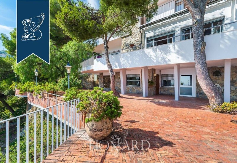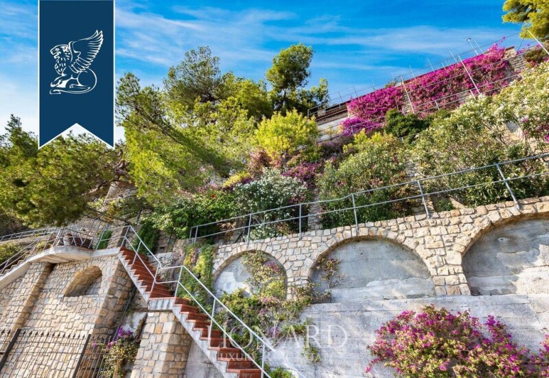 In a scenic position in the enchanting town of Bordighera, overlooking the crystalline sea of Western Ligurian, a few km from France, there is this unique villa is for sale, carved into the rock with a 1.4-hectare terraced garden and a splendid panoramic swimming pool. It was built in the 1960s, consists of two villas and measures 750 sqm. It was built with quality materials and finishes, employing cutting-edge techniques for the time and adding all comforts, including a thermal photovoltaic system. The property has a convenient lift and a goods lift, which connects the driveway and the portico to the main villa. A big panoramic terrace offering an enchanting view houses a 160-sqm loggia. The entrance is embellished with oak wood paneling, Vietri ceramic tiles, and a bespoke piano bar. The living area features relaxation areas adorned with a wonderful hand-sculpted red Verona marble fireplace and an oak bookcase. There is then a dining area with big French windows with access to an enchanting terrace overlooking the garden and the sea. The open space area is connected to a breakfast room and a spacious eat-in kitchen with access to both a spare area consisting of a laundry, a bathroom, a bedroom and a sitting room, and to a courtyard with a barbecue and a wood-burning pizza oven. The sleeping area houses a master bedroom with a private bathroom and a room with a jacuzzi, two double bedrooms, a twin bedroom and a second bathroom with Richard Ginori sinks. The rooms on this floor share access to a panoramic terrace. The property also offers a two-storey 180-sqm villa featuring two independent apartments with a living area, a kitchen, two double bedrooms and a bathroom. A 1.4-hectares terraced garden hosts both an orchard and a splendid panoramic swimming pool with a sunbathing area. In the highest part of the garden, it is possible to add a helipad. Ref: 0762.