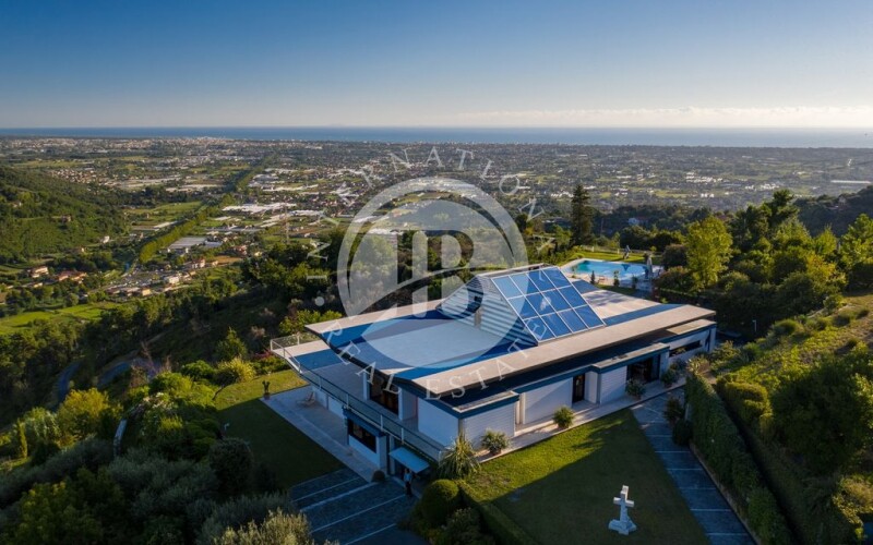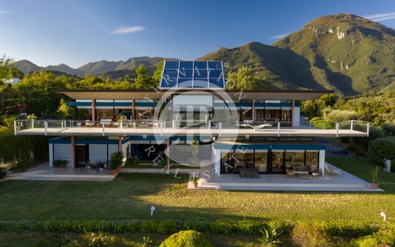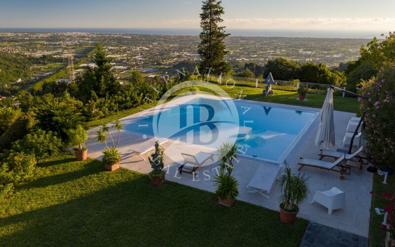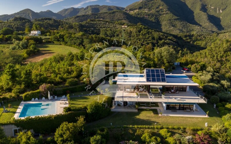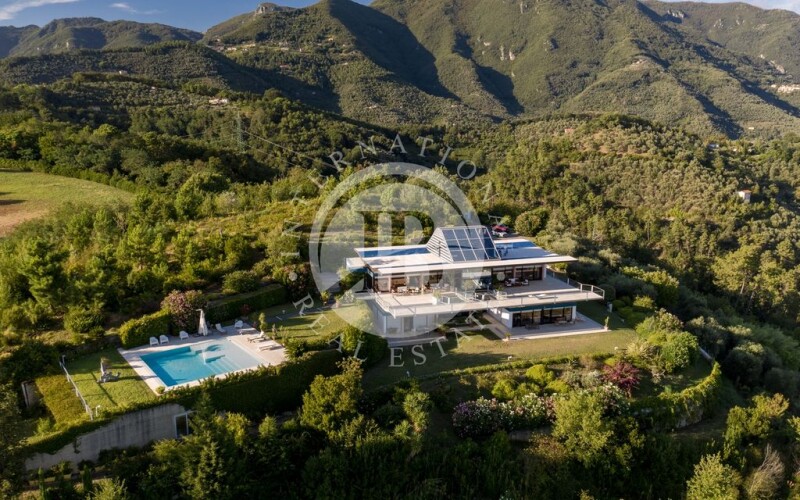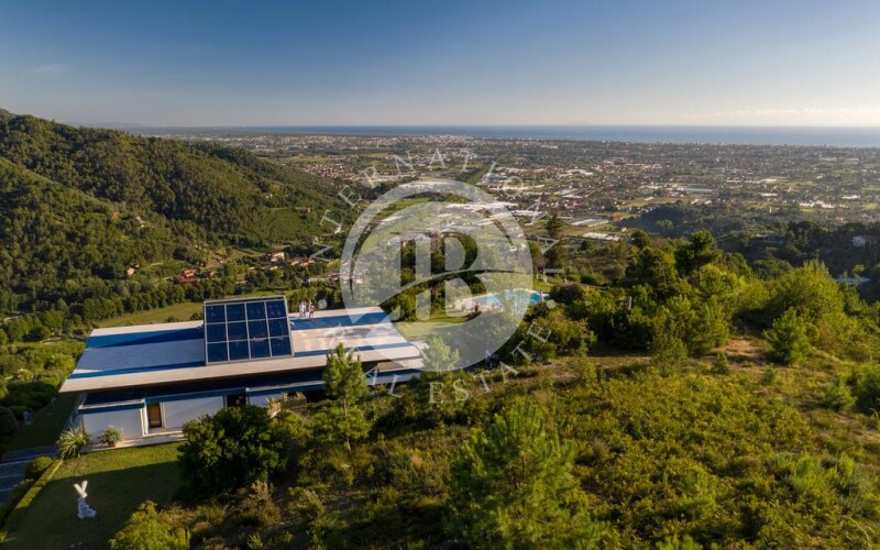 This stunning property with a unique design is located on the hills of Camaiore and offers a spectacular panoramic view of the Tyrrhenian Sea. Constructed with reinforced concrete and steel, the modern residence features expansive windows with seaviews and covered terraces. The surrounding land extends for about 4 hectares, with a lush garden in front of the property and a large pool with a hydro-massage area. The contemporary structure showcases polychrome windows framed by elegant matte black aluminum fixtures. The floors, made of white travertine with ceramic details, add a touch of sophistication, while the rooms are adorned with wooden planks. Each room also features a built-in wardrobe to maximize space and ensure functionality. The villa spans three floors with a total area of approximately 700 square meters, comprising the following: on the second floor, accessibile through the main entrance, there is a spacious panoramic living room with a dining area and an adjacent kitchen with a pantry, storage room, and guest bathroom. The sleeping area consists of two sea-view bedrooms with en-suite bathrooms, a study, a walk-in closet, and two additional bathrooms. The floor is surrounded by a cantilevered terraceideal for relaxation. The lower floor houses two separate apartments, one with another living room, a dining area, three bedrooms, three bathrooms, and three walk-in closets. On the western side, there is the second apartment, connected but independent, with two bedrooms, a bathroom, an open space with a living room, dining area, and kitchen. At the rear of the property, a spacious garage has been created, connected to the kitchen on the first floor, accommodating 3-4 cars comfortably and serving as a laundry area if needed. Finally, the third floor is dedicated to a living space with expansive 360-degree windows. Camaiore is a charmingtownlocated in Tuscany. Thispicturesque city isknown for itsquaintatmosphere, cobblestone streets, historic buildings, and extensiveviews of the ApuanAlps. Camaiore offers a blend of culture, gastronomy, and natural beauty, making it an ideal place to explore the Tuscancoast and the surrounding mountains. DISTANCES ➢ Villa → Main services: 200 mt ➢ Villa → Camaiore: 3.6 km ➢ Villa → Forte Dei Marmi: 16.1 km ➢ Villa → Aeroporto Pisa: 40 km ➢ Villa → Firenze: 107 km.