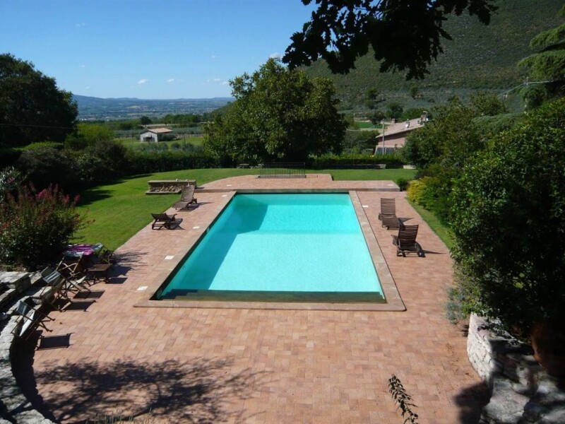 Villa Santa Maria is situated about 8 km north of Spoleto, a large old house standing in its own grounds, surrounded by 3.7 hectares of land, 2/3 of which is made up of mature and productive olive trees, also with fruit trees and age old oak trees, all completely fenced off and beautifully landscaped. A short driveway leads to an electric gate that gives direct access to the house and land. There is plenty of parking space outside the house and at the back there is also another separate access, with an additional car parking area. The property was originally a convent and it then became an olive pressing mill until the 1950's. On the ground floor the entrance leads into a hall, on the same level there is also a wine cellar, 2 storage rooms, a laundry room and 3 double bedrooms each with en suite bathroom. A grand staircase leads up to the first floor with a stunning very large living room with original terracotta floor tiles and oak roof beams. There is also a study with adjoining bathroom, which can also double as an extra bedroom if necessary, and a kitchen with pantry. The other half of this floor has been turned into an independent apartment with its own independent access via a stairway from the garden, but also joined by a lockable internal door to the living room of the main house. In the apartment are a kitchen, a living room and 1 bedroom with en suite bathroom, as well as a small mezzanine floor with extra sleeping space. In the gardens surrounding the villa there is a large swimming pool surrounded by a paved sunbathing area. There is an independent pool house with changing rooms and a bathroom. There is oil fired central heating in the whole property as well as pellet burning stoves and there is air conditioning in all bedrooms. There are also photovoltaic solar panels. There is a telephone line in the house with broadband Wi-Fi internet access. Mains water is connected and there is also a private well for garden irrigation. Within walking distance there is an excellent family run restaurant / pizzeria / B&B. Shops, restaurants, banks and all services are in nearby Spoleto. From here a Eurostar train service takes one to Rome in just 1 hour and 15 minutes. Perugia airport, with direct flights to London and other destinations, can be reached in 45 minutes. Rome international airport is 1.5 hours.