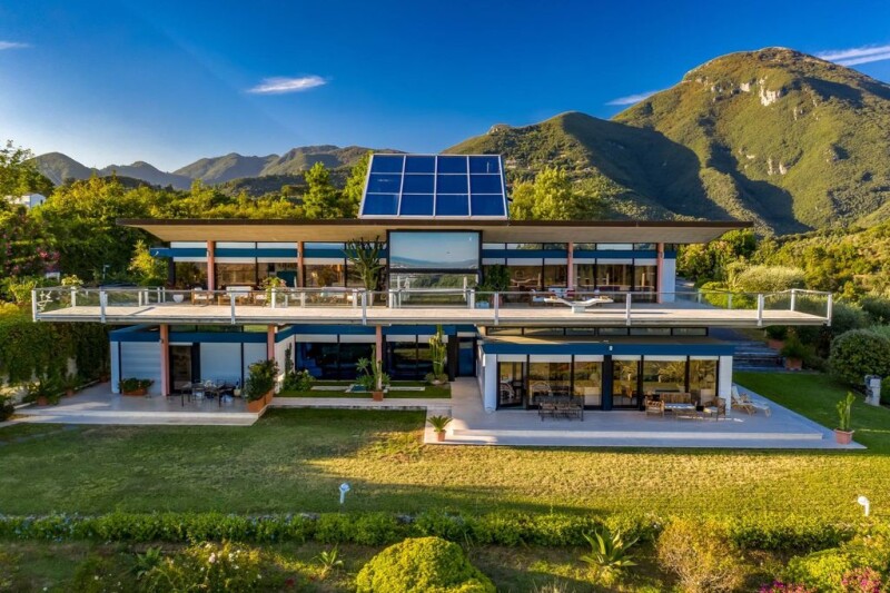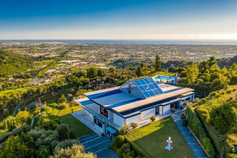 Villa "Casa che vola", built by the famous visionary and futurist architect, Lorenzo Papi, with swimming pool and panoramic view of Versilia, located on the hills of Camaiore. The Villa is located on the top of one of the hills of Camaiore, facing the Versilia coast and enjoys a suggestive panoramic view of the Tyrrhenian Sea, from the promontory of Livorno to the islands of Capraia and Gorgona, up to the north embracing the "gulf of poets" of La Spezia. The property is characterized by large windows towards the sea and covered terraces, completely free of pillars and columns, with shapes that recall the wings of a seagull and that project the house as if it were flying. The land of about 4 hectares, around the Villa, is characterized by a green and floral garden and by the typical uncontaminated Mediterranean scrub. The garden, which frames the Villa, hosts the large swimming pool with sea view, with mosaic and hydromassage area. The modern construction is made of steel and reinforced concrete, with partly reflective polychrome glass windows, which reflect the sky and the surrounding trees, framed by designer frames in matt black aluminum. Inside, the floors are in white travertine, with two bands of blue ceramic, the bathrooms in white and blue marine ceramic. The rooms are decorated with horizontal wooden strips, lacquered in white marine paint, which recall the style of the Yachts. The Villa is spread over three floors. On the floor located on the second terrace of about 260 square meters, you enter through the main entrance that gives access to the house and its large living room, with panoramic dining area positioned in the west area. Also on this floor we find the kitchen with adjoining pantry and closet, as well as a service bathroom. In the east area there is the sleeping area, with two panoramic sea view bedrooms with adjoining bathroom, the study, the bedroom / wardrobes and two other bathrooms. Externally the floor is surrounded by a covered terrace cantilevered, used as a relaxation area and sofas, to enjoy the magnificent sunsets of Versilia, where the sun dives into the sea. On the floor located on the lower terrace to the one just described, of about 370 square meters, we find in the east side area a large panoramic living room and dining area, with a view of a body of water that enhances the wonderful view of the sea. Three bedrooms, two of which are panoramic, three bathrooms and three walk-in closets. In the west side area there is an apartment connected to the house, with possible independent access, divided into two panoramic rooms with attached bathroom, open-space with living room, dining area and kitchen. In the rear part, towards the mountain, there are the service rooms and heating plant, as well as a large garage. On the top floor of about 50 square meters, accessed via an internal staircase where we find the astronomical observatory study, with large windows and a suggestive 360° view of the Alps up to the islands in front of the Tyrrhenian coast. The Villa was built to satisfy the requests of customers looking for a prestigious property, built with a modern and unique architectural style, where it is possible to enjoy relaxation and tranquility thanks to the beauty of the surrounding nature of the "Belvedere" hill. *EXCLUSIVE Sale of the Coldwell Banker Real Estate Agency - For privacy reasons the address on the card is indicative and the property is in any case located in the immediate vicinity*.