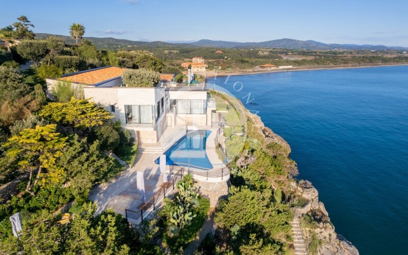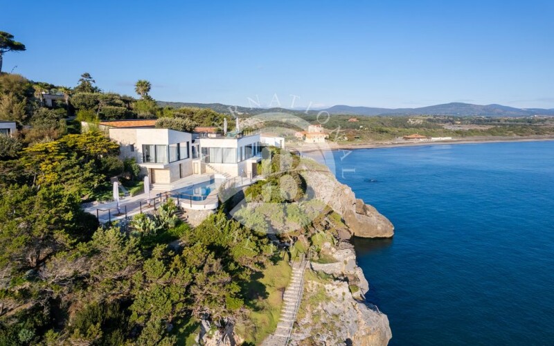 This waterfront luxury estate complex is nestled in a prestigious area renowned for its exceptional environmental and scenic value. Perched dramatically on the cliffside of the Ansedonia promontory, it offers unparalleled views of the sea, directly across from Monte Argentario. This prestigious estate spans approximately 6,000 sq m plot and comprises five separate residential units, each with its own unique charm. The complex offers unobstructed views of the open sea, with direct access via 2 private descents to the water: a wide descent serving the Villa Patio, and a more intimate one serving the annex, La Cuccia. The panoramic view not only embrace the vast expanse of the sea but also capture the beauty of Tagliata Beach and the rolling countryside. Expansive windows on the seaward side of Villa Il Patio create a breathtaking fusion between the indoors and outdoors, offering uninterrupted views of the spectacular surroundings. The Property Includes: • Main Villa Il Patio The crown jewel of the estate, this 447 sqm villa (excluding outdoor areas) boasts a unique layout that maximizes both luxury and panoramic views. • Annex of the villa - La Cuccia Approximately 175 sqm, is nestled at the far end of the estate's private road, offering breathtaking views over the ancient Etruscan Tagliata and the sea beyond. • The Guesthouse Measuring 74 sqm, this guesthouse features a living room with kitchenette, a hallway, bedroom with an en-suite bathroom, and a 124 sqm terrace - perfect for hosting visitors or creating a private retreat. • Two Gatehouses Situated just beyond the main entrance gate, these fully renovated gatehouses are located near a spacious courtyard that serves as parking and a manoeuvring area. A complete and masterful renovation, led by renowned architect Enrico Gobbi and his team in Venice, was carried out between 2016 and 2020. This transformation, while maintaining the original footprint of the buildings, has introduced a stunning new architectural vision. The exteriors have been reimagined, featuring raw travertine stone facades, while the interiors have been meticulously crafted with premium materials such as marble and wood, seamlessly blending luxury with sophistication. Custom-designed furnishings, intricate wooden panelling and every attention to detail contribute to the elevated aesthetic.