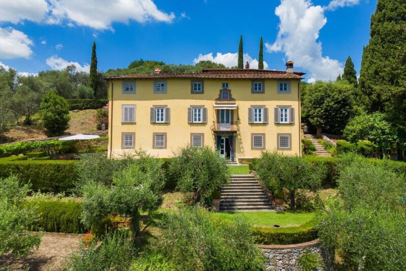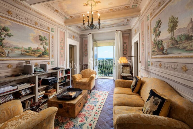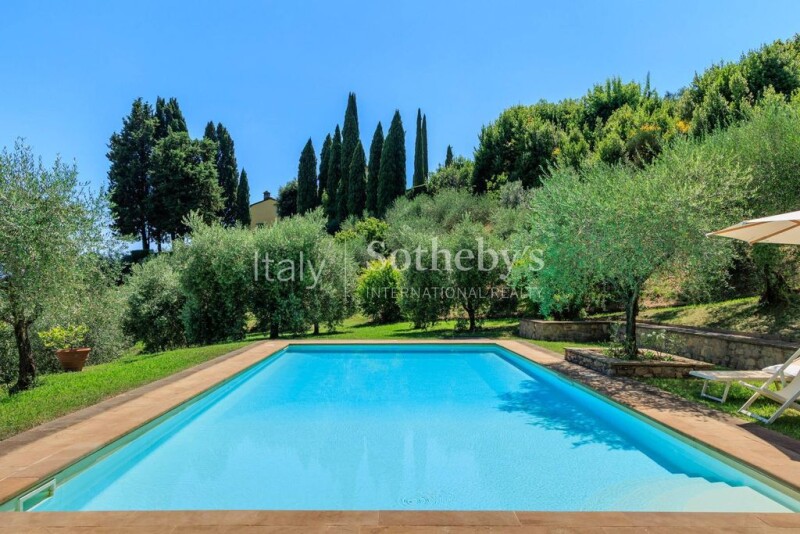 In one of the most exclusive areas of Lucca, situated on a hill with a panoramic view of the surrounding countryside and the towers of the ancient medieval city, lies this beautiful historic villa dating back to the early 18th century. The villa comes with a farmhouse, two pools and three hectares of land, mostly cultivated with olive trees. The ancient villa, approximately 550 sq. m., spans three levels and its interiors still retain the original frescoes in perfect condition. The ground floor consists of a spacious entrance hall, a living room with a beautiful marble fireplace, a dining room with a seating area and another large fireplace, a wardrobe, a bathroom, a kitchen, and a laundry room. The first floor includes a library/lounge, a master bedroom with a large walk-in closet and en-suite bathroom, a double bedroom, a bathroom, and access to the private chapel, which can also be accessed from outside. The second floor hosts a double bedroom with an en-suite bathroom, three double bedrooms, and two bathrooms. The farmhouse, approximately 225 sq. m., was completely renovated in 2007 with high-end finishes and features a magnificent pool and a spacious veranda. On the ground floor, the entrance leads to a master bedroom with en-suite bathroom and walk-in closet, as well as two additional master bedrooms with private bathrooms. The first floor features a large open-plan living area with an adjoining dining room, equipped with a fireplace, high ceilings, and large windows offering a 360° view of the Lucchese hills. The dining room and kitchen provide access to a veranda. The second floor comprises a spacious master bedroom with an en-suite bathroom and two additional master bedrooms, each with a private bathroom. The property is completed by a charming and well-maintained Italian garden, a separate stone building with a bathroom and storage area, and a 12 x 6 m pool located right in the middle of the olive grove, enjoying the entire panorama.