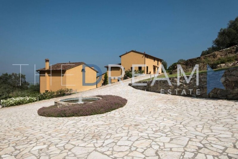 LOCATION At the foot of the protected area of Calvana, not far from Florence, you'll find Villa del Sole, an elegant country house with a pool and a separate guest house. The privileged location provides easy access to the amenities below and the main routes connecting to Florence and the rest of Tuscany. The property is completely immersed in greenery, ensuring maximum privacy and a serene environment for guests. GARDEN AND OUTDOOR SPACE Villa del Sole's garden is surrounded by olive trees producing exquisite olive oil and strategically positioned to ensure high sun exposure. At the center lies a heated pool with breathtaking views of the underlying landscape. The outdoor space is complemented by a convenient canopy, ideal for outdoor dinners and events, especially during the summer. INTERIOR LAYOUT Villa Ground Floor: A cellar, a laundry room, a technical room, five hallways, two bathrooms, two bedrooms (one with en-suite bathroom and wardrobe, and one with en-suite bathroom), a fitness area with sauna, gym, and chromotherapy. First Floor: Studio, living area, eat-in kitchen, living room with access to the garden, a bathroom, a hallway. Second floor: A hallway, two bedrooms with en-suite bathrooms. Dependance Ground Floor: An eat-in kitchen and living area. First Floor: Bedroom with en-suite bathroom. FINISHES Exploring the Villa and its annex, meticulous attention to detail and a refined selection of materials that give a distinctive character to the surroundings become evident. The floors, elegantly crafted in shades of white wood, harmonize seamlessly with the ceramic-covered bathrooms and the walls of the rooms coated with polished cement. The ceilings, enriched with exposed beams and terracotta tiles, impart authenticity and warmth to the spaces. Both the roof of the Villa and that of the annex are made of Tuscan terracotta tiles and wooden beams, recalling the details and characteristic style of the property. The outdoor furnishings blend perfectly with the surrounding environment, reflecting the classic Provencal style. Along the external surface of the property, dry stone walls with exposed faces evoke the typical atmosphere of Tuscany, integrating beautifully with the olive trees surrounding the Villa. The pool edge and the main entrance are made of broken Carrara marble. The pool, with an infinity effect and a fabric cover, adds a touch of luxury. The canopy houses a living area and a dining area, while the interior furnishings, contemporary and sophisticated in design, allow for maximum privacy with internal shutters. The Villa also features a fitness area with a sauna and tub, both adorned with splendid mosaics, contributing to a complete wellness experience.