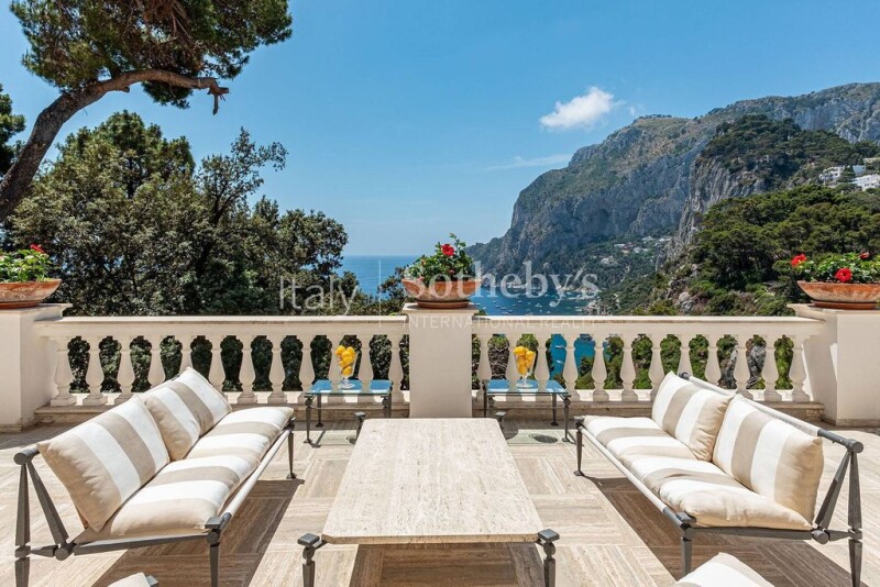 A few steps from the famous Via Camerelle, set in the greenery of its centuries-old park, we find this monumental estate from the early 1900s. The villa stands imposingly in the heart of the park that extends from the center of Capri to the outer ridge overlooking the Faraglioni. The tree-lined entrance, which leads us to the property, catches the eye thanks to the suggestive view over Marina Piccola's bay. Both the elegant living room and the dining room overlook a wonderful terrace from which, in addition to the enchanting sea view, you can enjoy the panorama of Capri's village, a natural nativity scene suspended between greenery and sea. On the first floor we also find a spacious kitchen, a guest bedroom with bathroom, and the uber panoramic master suite with two accesses to the terraces, walk-in closet, en-suite bathroom and sauna. The lower floor consists of another wide living room and two other bedrooms with bathrooms. A guest bathroom, a staff area and a laundry room complete the villa. A few steps from the main villa we find also a small dependance with bathroom and kitchen. A breathtaking terrace with a classic Capri colonnade frames the view of the Faraglioni. The property has an authorization already issued for the construction of a swimming pool.