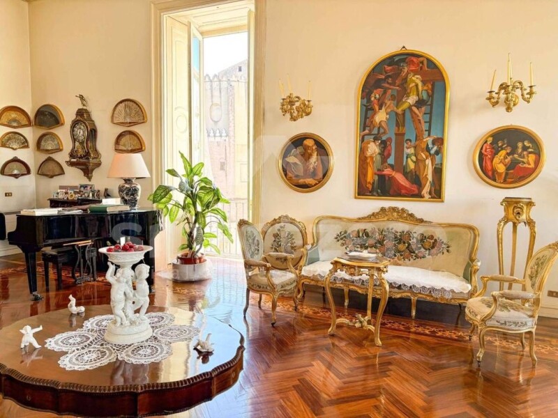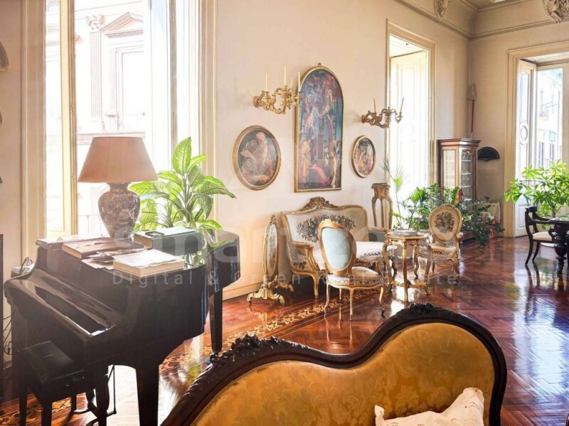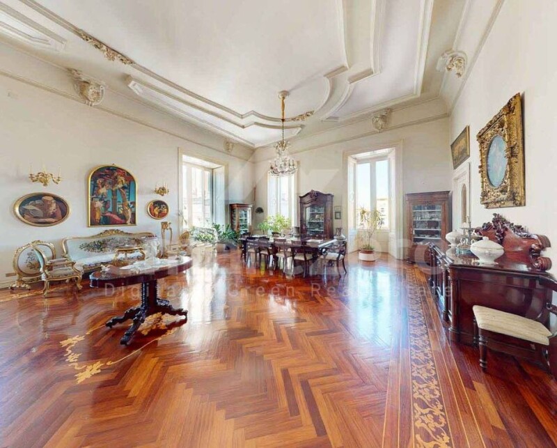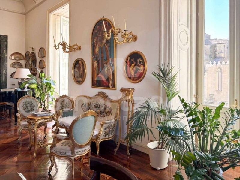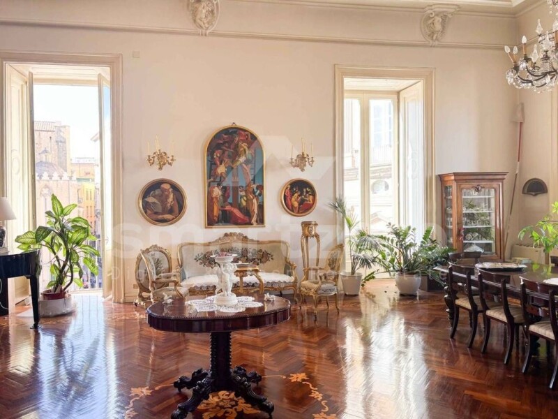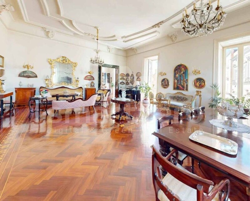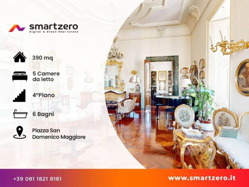 Exclusive large square apartment in one of the most beautiful sites in Naples, Piazza San Domenico Maggiore. The solution located on a high floor with elevator has 8 balconies on the Piazza and the adjacent Piazzetta Nilo and has finishes of high value even historical value. THE PROPERTY One of the strengths of this exclusive solution is certainly the triple lounge of over 100 square meters, with its splendid ceilings 6 meters high, equipped with a rare parquet in Afromosia and with 4 balconies, 2 on Piazza San Domenico Maggiore and 2 on Piazzetta Nilo. Another plus of the apartment is the presence of a double entrance, which makes the solution also divisible into two distinct real estate units. The property is partially solfted, in compliance with current regulations, as it takes full advantage of its considerable height. In total, in addition to the triple living room, we find another large room overlooking the Piazza and 6 rooms with as many bathrooms. The spaces of this single property are completed by a kitchen and a comfortable laundry room. Among the other fine finishes that we find in the property are certainly the solid wood doors with glass decorated with decorations made through silver castings and wet handles in 18k gold, as well as some splendid portals in precious green marble. In addition, the solid wood fixtures are with double glazing with a thermal break and soundproofed. The property is offered in negotiations reserved only for selected customers. The Property deals with both the Sale of the entire property and the bare property, for more info it is possible to schedule a personalized consultation and also make a virtual visit. THE BUILDING AND THE AREA The period building where the building is located, is in an excellent state of maintenance and is equipped with a lift. The location is unique in that we are in one of the most iconic places in the city of Naples, the beating heart of the Neapolitan historic center, declared a World Heritage Site by UNESCO. A few steps away we find the Cristo Velato di Sanmartino, the monastery of Santa Chiara and the Metro dell'Arte, among the many tourist attractions in the area.