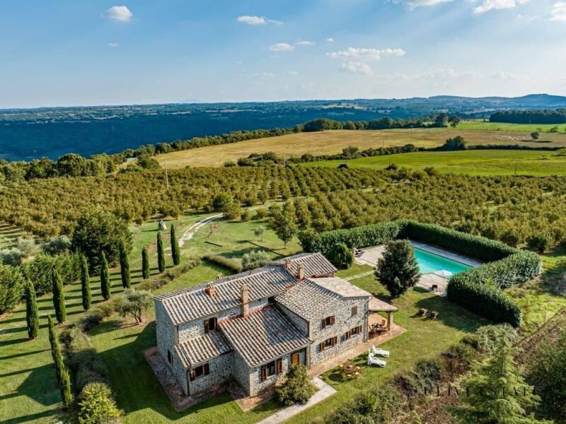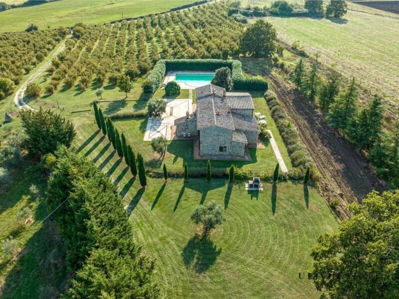 Il podere Si trova a soli 15 km dalla autostrada A1 Casello di Orvieto, ha una superfice di 6.5 ettari di cui un ettaro è a terreno boschivo i rimanenti 5.5 sono divisi tra una parte, circa 3.5 ettari, dove si estende un impianto di noccioleto composto da 1300 piante, su un’altra parte circa 1.5 ettari è presente un impianto di uliveto di 500 piante con le qualità di Moraiolo, Frantoio e Leccino. I rimanenti 0.5 ettari sono coltivati ad ortaggi e fiori, tutto il terreno e i prodotti sono certificati biologici. Sparsi nella proprietà ci sono anche varie piante da frutto, fichi di diverse specie e ciliegie. Alla proprietà si accede da un grande cancello in ferro battuto passando per un viale delimitato da 20 castagni e 30 cipressi che disegnano il percorso. Il casale Nasce al centro del podere, risale alla seconda metà del 1800 ed è stato abitato fino agli anni 1970 per poi rimanere disabitato fino al 2004 anno in cui è stato ristrutturato. Il casale copre una superfice di circa 450 mq ed è composto da 3 appartamenti. Il primo su due livelli ha una superfice di circa 250 mq, al piano terra troviamo cucina, ampio salone con camino, una camera e un bagno pavimentato in cotto di Castel Viscardo; al secondo piano tre camere grandi, un bagno pavimentato in parquet. Il secondo di 110 mq composto da grande salone con camino, cucinotto, due camere e due bagni tutto pavimentato in cotto di Castel Viscardo. Il terzo di 80 mq composto da cucina, salone, un bagno e una camera, tutto pavimento in cotto di Castel Viscardo. Tutti gli appartamenti sono dotati nelle cucine di acquai realizzati da blocco pieno di marmo di Carrara. All’esterno è presente un piazzale tutto in travertino con una piscina di 15 metri per 7 dotata di una scala romana per permettere l’ingresso con un raggio di 3,5 metri. E’ possibile con una spesa veramente ragionevole unire gli appartamenti in uno maggiore ed uno minore per gli ospiti, oppure tutti e tre in una unica abitazione. Nel giardino è presente anche un barbecue in muratura e connesso alla casa c’è un locale adibito a forno a volta completamente ristrutturato dove un tempo veniva cotto il pane anche per i casali intorno. Il casale è dotato di una fossa settica ed è fornito di acqua dell’acquedotto. E’ provvista anche di una cisterna di recupero delle acque piovane di tetto e piazzale che può essere usata per irrigare il giardino ad esempio. Gli appartamenti sono tutti termo autonomi alimentati a GPL con termosifoni in ghisa. La dependance All’interno della struttura in prossimità dell’abitazione esiste un annesso agricolo di circa 120 mq. La struttura è nuova, demolita e rifatta nel 2004 esattamente come era. Esiste altresì un progetto di ampliamento di ulteriori 70 mq come destinazione di uso garage . Nel totale 190 mq, 125 a garage e 65 uffici e deposito materiale ( piccolo appartamento).