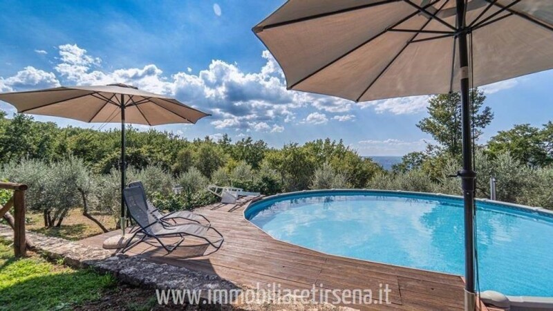 Umbria - Orvieto Approximately 25 km from Orvieto and only 2 km from the characteristic medieval village of Montecchio , in a hilly and panoramic position , beautiful stone farmhouse completely renovated in 2005 with a cadastral area of SQM 303 on two levels arranged as follows: on the Ground Floor a large entrance hall with cast iron and ceramic wood stove, wardrobe, living room on two levels with dining area, living lounge and large fireplace, large kitchen in brick and stone with integrated fireplace, large pantry; three bedrooms, hallways and two bathrooms; large panoramic porch, with views up to Mount Amiata and Mount Argentario, with large stone table and wood-burning oven; From the porch there is access to an above-ground swimming pool of 8.5 m in diameter, placed in a custom-designed structure (made of processed wood, useful for poolside use with sun loungers and umbrellas) and equipped with a solar panel shower; Technical room with washroom, central heating system management, entirely implemented on the floor area. On the First Floor a large master bedroom with en suite bathroom, another bedroom with large built-in closets, a second bathroom, a hallway and a panoramic balcony. The interiors have been refined with typical, quality materials: the floors are made of hand-polished natural terracotta tiles; the walls are dye finished; the bathroom facings are made of natural travertine tozzetti; the exterior wooden window frames are equipped with shatterproof glass and dark interior doors; the doors are wax finished; the ceilings are entirely made of multi-layered oak beams and exposed terracotta tiles. They feature a consistent layer of insulating material on top and are externally refined with antique roof tiles; Exteriors: the porch ceilings are made of chestnut beams and exposed tiles. They are covered with antique roof tiles; the gutters and related downspouts, are made entirely of copper; the household's security is ensured by a perimeter and volumetric alarm system. In addition, all windows are protected by iron grates. Energetic efficiency: there are photovoltaic panels for a production of a total of 6Kw and two storage batteries for a total of 10 Kw; Internal comfort is also ensured by the presence of Daikin hot/cold air conditioners, recently installed. Access to the property, consisting of approx.10,000 square meters fully fenced, is through a large yard in which there is a covered parking for two cars; there is a masonry kennel for dogs and a fountain .The area surrounding the house is equipped with lighting system. Irrigation can be managed automatically through a large rainwater collection tank equipped with an immersion pump. The tank is topped by a stone and wrought-iron well. The remaining land has numerous oak and holm oak trees, an olive grove of about 200 trees, fruit and flowering plants. The property is also complemented by a bocce court, a stone table in the woodland area, a tuff cave, equipped with water and electrical system and a woodshed made of processed fir . The property has a comfortable and easy access, it is about 18 km from the A1 Rome-Milan highway exit of Attigliano and about 80 km from Rome North.