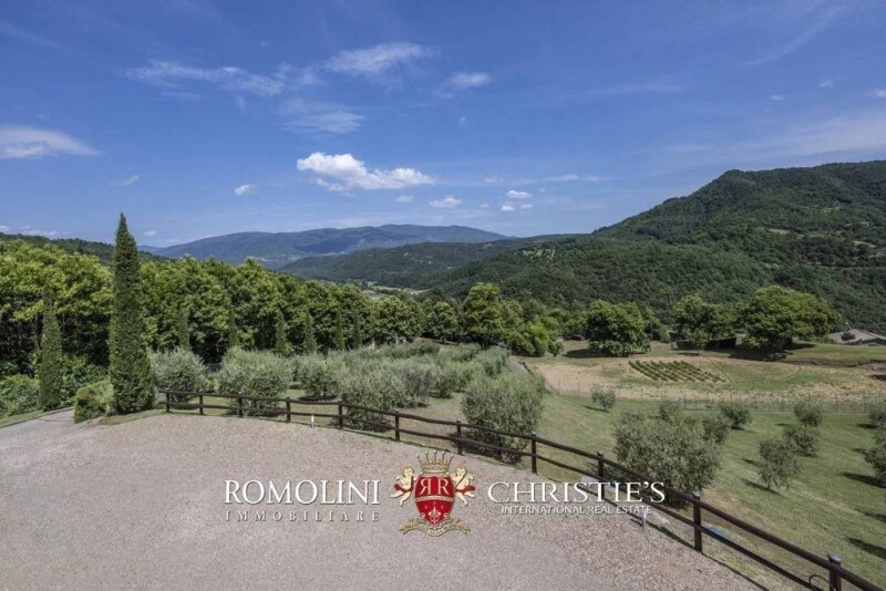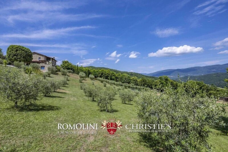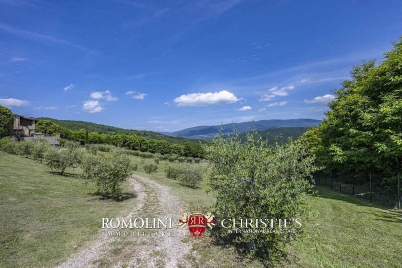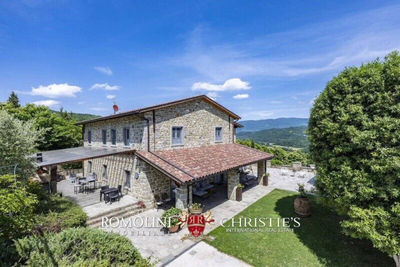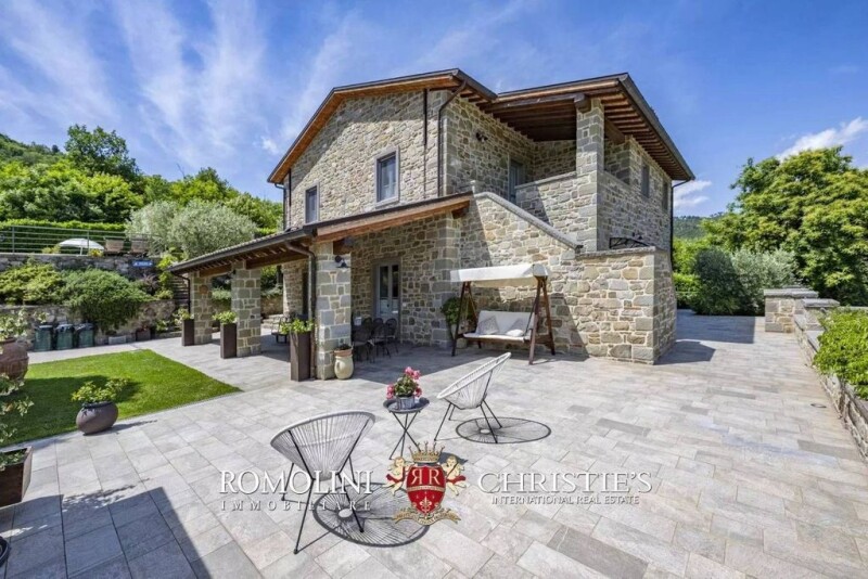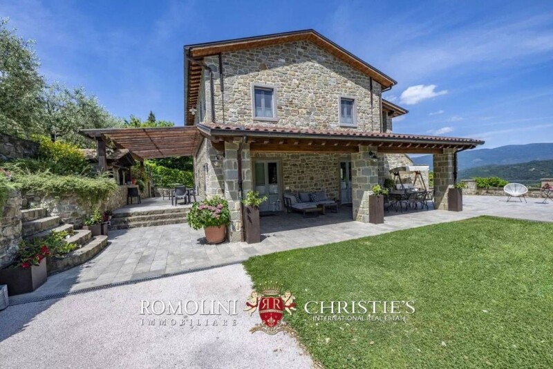 On the hills of the Casentino, in a very quiet and reserved position, a characteristic renovated stone farmhouse with swimming pool and olive grove. The house, very suitable both as a private residence and as a small receptive business, has been entirely adapted to modern standards with an eye to energy efficiency. The 7,680-sqm park includes a 10 × 5 m swimming pool and 100 olive trees. The villa, although surrounded by greenery, is not far from a small town with all essential services (2km; 5’) and the villages of Bibbiena and Subbiano (20’ by car). The Casentino, an area of rare natural beauty, is located between Florence and Arezzo and many of Tuscany’s most famous centres can be reached in less than two hours. DESCRIPTION OF THE PROPERTY The villa (358 sqm – 3,852 sqft, 6 bedrooms and 6 bathrooms) is on three levels in total and has been recently renovated with particular attention to energy efficiency with the installation of an insulating coat, pellet boiler and solar thermal system (energy class A4) that supply the underfloor heating. The bedrooms on the first floor are also equipped with air conditioning for the summer. The basement can be reached by an internal staircase and is characterized by a large glazed area giving direct access from outside. This room, currently a garage, could be used as a fitness and wellness area with a gym and a whirlpool bath. The ground floor consists of a large living area with a dining room, equipped kitchen and living room with fireplace. On this level there are also two bedrooms and two bathrooms. The first floor, on the other hand, is devoted entirely to the sleeping area with four bedrooms, all with en-suite bathrooms. One of the rooms is particularly spacious and also has direct access from outside via stone stairs, as well as being embellished by a splendid panoramic loggia. The villa is located within an enclosed park of 7,680 sqm, where there is a 10 × 5 m swimming pool (heated) and a regulation tennis court. Along the driveway, which is equipped with an automatic gate, approximately 100 olive trees have been planted to produce a small quantity of excellent oil for private use. Due to its characteristics, this property lends itself very well to being used both as a private residence with all comforts, and for tourist accommodation use. The owners currently rent the entire property (as a single solution) to groups interested in peace and tranquility in the Tuscan countryside. CLOSEST CITIES AND TOWNS Closest services (2km; 5’), Subbiano (12km; 15’), Bibbiena (13km; 20’), Poppi (19km; 25’), Chiusi della Verna (25km; 35’), Anghiari (37km; 45’), Cortona (53km; 1h 10’), Florence (74km; 1h 20’), Siena (79km; 1h 25’), Pienza (81km; 1h 25’), Monteriggioni (95km; 1h 35’), Volterra (148km; 2h 25’), Pisa (159km; 2h 10’) CLOSEST AIRPORTS Firenze A. Vespucci (95km; 1h 25’), Perugia San Francesco (111km; 1h 45’), Forlì L. Ridolfi (113km; 2h 5’), Pisa G. Galilei (156km; 2h), Bologna G. Marconi (177km; 2h 15’), Roma Ciampino (253km; 2h 50’), Roma Fiumicino (267km; 2h 55’).
