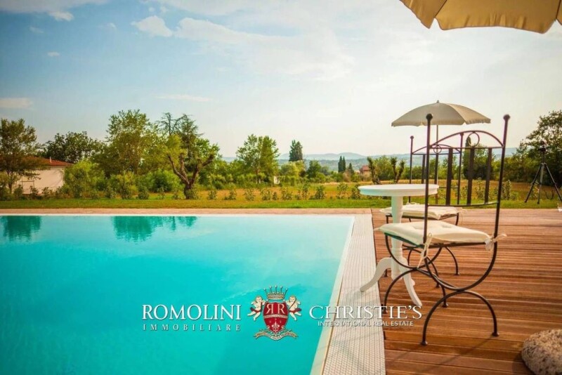 In the Tuscan countryside, just outside a town, this resort is made up of a finely restored farmhouse (900 sqm) used for an accommodation business with 9 independent apartments. All around, a well-maintained 5,000-sqm garden houses the pool with spa and a gazebo for events with 40 seats. The town offers all the necessary services (supermarkets, banks, post offices, pharmacies) and can be reached in less than five minutes by car. From here, one can then move throughout the many historic cities of Tuscany (Torrita di Siena, Castiglion Fiorentino, Montepulciano, Cortona, Pienza, Montalcino, Siena and Florence) that can be reached in less than an hour, also thanks to the A1 highway junction nearby. For shopping-lovers the Valdichiana Outlet Village is located a short distance from the property and can be reached by car in less than ten minutes. The closest airport is Perugia (66km; 50’) but for international flights the suggested terminals are Pisa (177km; 2h), Bologna (198km; 2h 10’) and Rome (200km; 2h). DESCRIPTION OF THE BUILDINGS The farmhouse (900 sqm – 9,684 sqft, 9 bedrooms and 9 bathrooms), probably dating back to the late Middle Ages/Renaissance, has been entirely restored in 2011 following anti-seismic criteria and using biocompatible that also grant excellent energetic performances (energy class B). The building was also reworked to accommodate an accommodation business with nine apartments. Detached from the farmhouse, right next to the pool, an ample gazebo (100 sqm – 1,076 sqft) has been built and is currently used for events (with 40 seats in total). EXTERIORS The garden surrounding the buildings (roughly 5,000 sqm) is equipped with an irrigation system and accommodates, other than a few secular olive trees, the beautiful 14 × 7 m Infinity pool with solarium and outdoor Spa (5 seats). The basin is equipped with led lighting, salt sterilization, sand filtering and heating system. Ample aprons (circa 1,500 sqm – 16,140 sqft) offer a convenient space for guests’ cars. USE AND POTENTIAL USES The farmhouse has been recently restored and, during this works, permissions were obtained to expand the buildings and part of these volumes were used to build the gazebo in the garden. The remaining cubic meters (roughly 900) can be exploited to increase the number of bedrooms or built other structures for events. CLOSEST CITIES Town with services (2km; 5’), Torrita di Siena (11km; 15’), Castiglion Fiorentino (18km; 20’), Montepulciano (21km; 25’), Cortona (23km; 25’), Pienza (28km; 40’), Arezzo (42km; 35’), Montalcino (46km; 50’), Siena (51km; 45’), Orvieto (77km; 55’), Florence (105km; 1h 20’) CLOSEST AIRPORTS Perugia San Francesco (66km; 50’), Firenze Vespucci (117km; 1h 15’), Pisa Galilei (177km; 2h), Bologna Marconi (198km; 2h 10’), Roma Ciampino (199km; 2h 10’), Roma Fiumicino (214km; 2h).