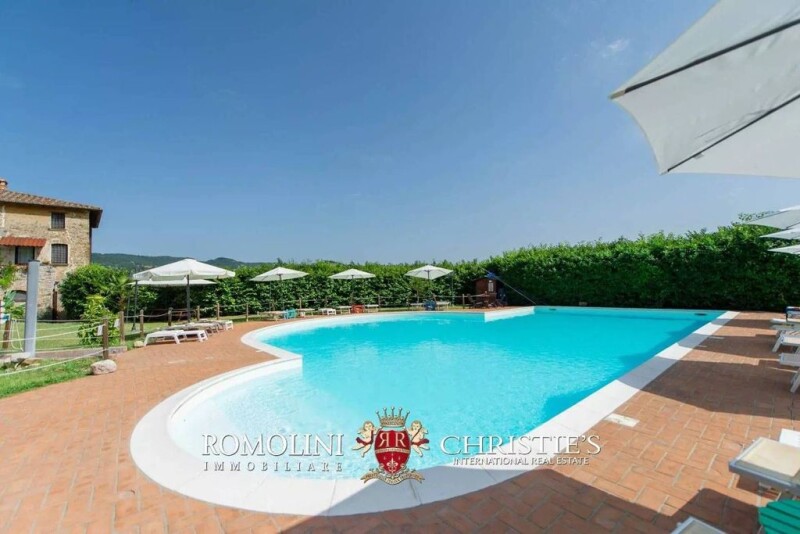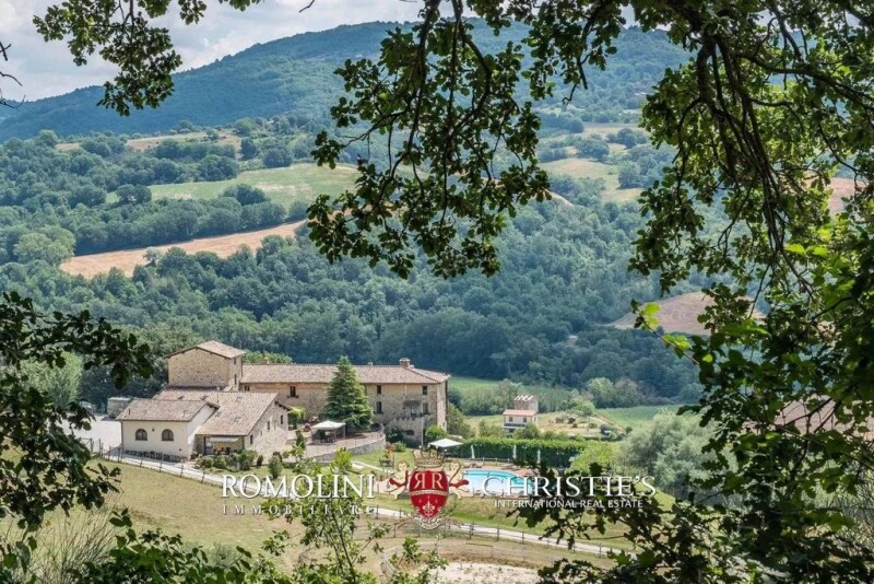 In the hills of Umbria, not far from Umbertide, organic farm of 13.6 hectares with Agriturismo and riding stables for sale. The residential buildings, renovated in recent years, have been divided into apartments and guest bedrooms and include a large restaurant. The land is all organically cultivated and contains 2,800 olive trees and a paddock for horses in front of the stable. The property is located not far from the services, available down towards the Tiber Valley (6km; 10'), and from many of the best-known art cities of Tuscany and Umbria (Città di Castello, Perugia, Cortona, Assisi, Pienza, Siena...). DESCRIPTION OF THE BUILDINGS The main farmhouse (542 sqm – 5,832 sqft, 9 bedrooms and 11 bathrooms), dating back to the 19th century, has been entirely renovated and converted into an Agriturismo. The common areas include the reception, a large restaurant hall with professional kitchen, staff bathrooms, guest bathrooms and a spacious hobby room on the first floor. Five bedrooms (all with their own private bathroom) and four apartments are available for guests: - Apt. N°1 (34 sqm – 366 sqft): living room with kitchen, bedroom and bathroom; - Apt. N°2 (33 sqm – 355 sqft): living room with kitchen, bedroom and bathroom; - Apt. N°3 (49 sqm – 527 sqft): living room, kitchen, bedroom and bathroom; - Apt. N°4 (47 sqm – 506 sqft): living room, kitchen, bedroom and bathroom. An old farm outbuilding has instead been converted into a charming guesthouse (174 sqm – 1,872 sqft, 3 bedrooms and 3 bathrooms) that houses two large recreation rooms for guests, a bedroom and an apartment currently inhabited by the owners but easily adaptable to accommodate guests: - App. N°5 (87 sqm – 936 sqft). large living room with dining area, kitchenette, cloakroom, two bedrooms and two bathrooms. Not far from the two buildings, surrounded by a terracotta solarium and a well-kept garden (approx. 3,800 sqm), is the 15 × 12.5 m swimming pool, ideal for cooling off on hot summer days. To the south of the buildings, in a flat position, is a large stable (202 sqm – 2,173 sqft) with six stalls for the horses (complete with drinking and eating trough), an outdoor paddock, a tool storage and a shed with a shower for the animals. EXTERIORS The estate covers a total area of 13.6 hectares (33.6 acres), spread over the surrounding hills. Most of the land is covered by arable land and pastures (9.4 ha), further proof of the estate’s equestrian vocation, with small areas covered by trees (0.3 ha). The farm’s land is all managed using organic methods certified by ICEA, including the large olive grove (about 2,800 trees, many newly planted) that produces an excellent extra-virgin oil that is then served in the farm restaurant. A convenient gravel yard (600 sqm) is located at the entrance to the property and allows guests to park several cars just outside the buildings. CLOSEST CITIES AND TOWNS Umbertide (6km; 10’), Montone (12km; 15’), Pietralunga (24km; 35’), Città di Castello (25km; 25’), Perugia (37km; 35’), Magione (39km; 40’), Sansepolcro (41km; 35’), Cortona (44km; 55’), Assisi (50km; 45’), Arezzo (63km; 55’), Montepulciano (73km; 1h 15’), Pienza (87km; 1h 30’), Montalcino (107km; 1h 50’), Siena (117km; 1h 35’), Florence (142km; 1h 45’) CLOSEST AIRPORTS Perugia San Francesco (36km; 30’), Firenze A. Vespucci (151km; 1h 45’), Grosseto C. Baccarini (192km; 2h 25’), Bologna G. Marconi (215km; 2h 153’), Roma Ciampino (216km; 2h 15’), Pisa G. Galilei (222km; 2h 50’), Roma Fiumicino (240km; 2h 32’).
