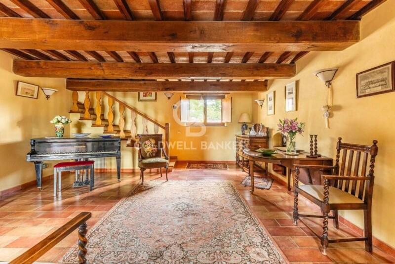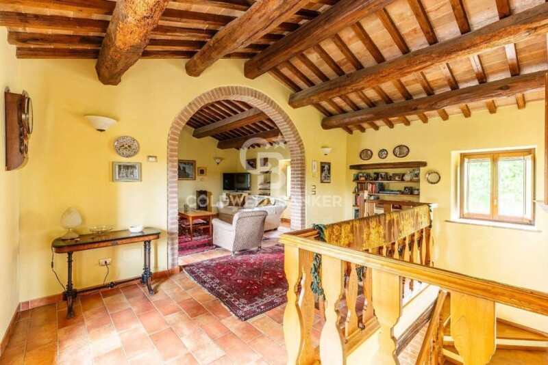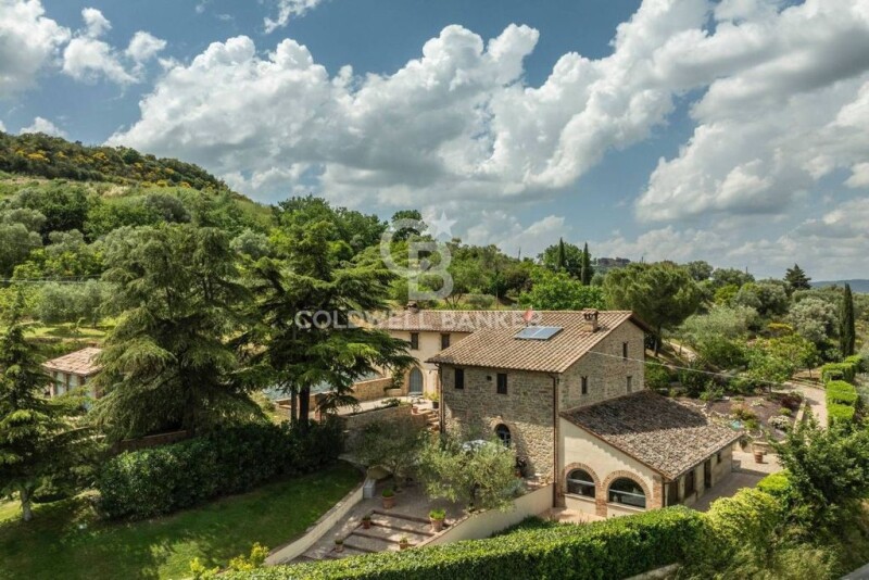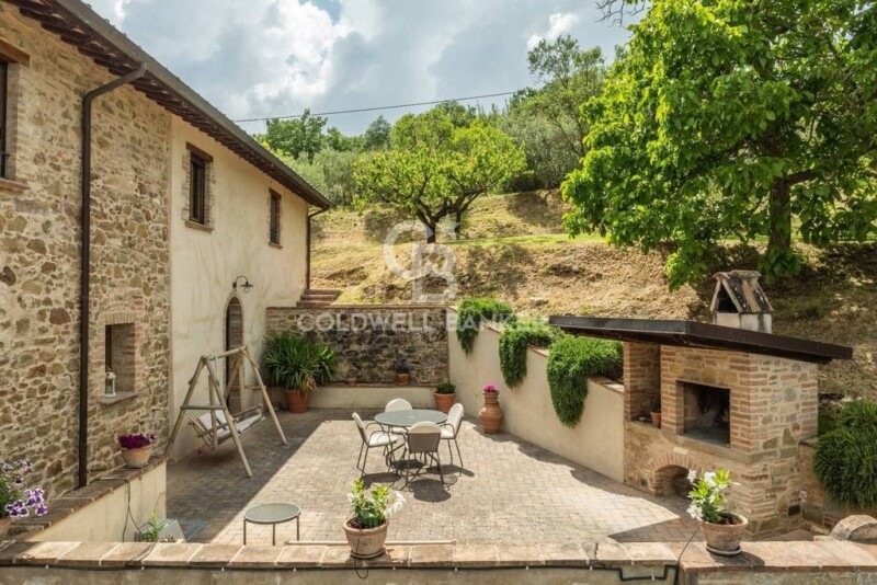 PROPERTY DESCRIPTION Located between the Castles of Montemelino and Montesperello, just ten minutes from Lake Trasimeno and twenty minutes from Perugia and its airport, we offer for sale this typical Umbrian farmhouse of approximately 400 m2 on three main levels. The property, thanks to its close proximity to the town of Solomeo, benefits from the artistic, sporting and exceptional theater facilities offered by the Cucinelli Cashmere Foundation. Immersed in a quiet and private green setting, it boasts an enchanting and lush private garden of approximately 1 hectare, including 60 olive trees and various fruit trees. In addition to a terrace already set up to comfortably accommodate a swimming pool. INTERNAL COMPOSITION The house offers generous and well-proportioned spaces and is served by four independent entrances. The ground floor, dedicated to guests and served by two independent entrances, consists of a study and a comfortable guest room with en-suite bathroom equipped with shower and suspended bathroom fixtures. On the level below we find a large open space living area, one of the most appreciated and enjoyed areas of the property, consisting of the music room, a bright marble dream kitchen with dining room and wood stove, and from which you have direct access on the stern court. An environment of authentic and elegant rustic charm, where every detail has been masterfully designed to offer a perfect combination of style and functionality. To complete the living area, a relaxing and bright living room, embellished with large arched windows that allow natural light to fall on every detail and where the view of the outside gives a feeling of peace and relaxation. In addition, to the laundry area and a guest bathroom. The sleeping area on the first floor is instead composed of a pleasant living room with wood stove, embellished with exposed wooden beams and terracotta tiles and where the traditional wall niches of the ancient farmhouse have been maintained, creating a suggestive and d 'era; a master bedroom with a large wooden walk-in wardrobe and a second double bedroom, also equipped with a wooden walk-in wardrobe and an en-suite bathroom, complete with both a bathtub and a shower. STATE AND FINISHES The residence, the subject of an important and meticulous renovation in 2007, is in excellent condition ready to welcome the new owners without the need for further interventions. Equipped with underfloor heating and every modern comfort, it represents the perfect meeting between charm and tradition. Characterized by architectural elements typical of the Umbrian style, such as terracotta, brick arches and wooden beams with exposed tiles which give an authentic and faithful touch as well as a warm and welcoming atmosphere. OUTDOOR SPACES Surrounded by a private and completely delimited garden of approximately 1 hectare, the property enjoys a pleasant and well-kept outdoor space,.