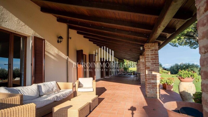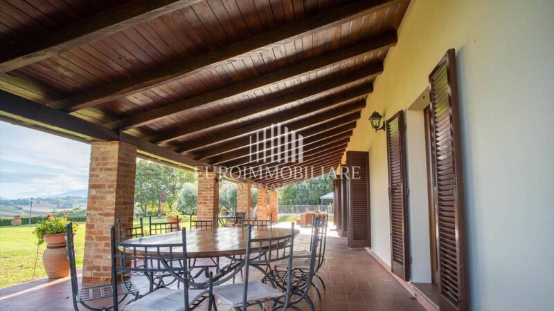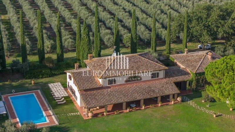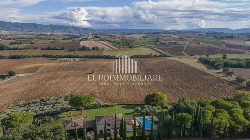 This splendid farmhouse, located in the municipality of Castiglione del Lago, stands out for its large spaces and the rustic elegance that characterizes it. The property, with a surface area of approximately 760 square meters, is spread over two levels, offering numerous possibilities for use, both as a private residence and as a high-level accommodation facility. Ground Floor: Upon entering, you are greeted by a large living room with rustic charm, with a spacious dining room located on the right, perfectly connected to two kitchens: one generously sized and a smaller but professional one. On the left side, there is another living room with a fireplace area, ideal for moments of relaxation, which leads to two bathrooms and a double bedroom with private bathroom. First Floor: From the ground floor, two large staircases lead to the upper level. The right staircase leads to a mezzanine living room, connected to a bedroom with adjacent bathroom. The left staircase, made entirely of wood, leads to a bright living room overlooking a splendid panoramic view. A hallway leads to the main sleeping area, with two bedrooms with private bathrooms, two more bedrooms with shared bathrooms and a closet. On the opposite side, two more bedrooms with private bathrooms complete this floor. Exteriors and Comfort: Outside, a large porch of about 100 square meters invites you to enjoy moments of tranquility or conviviality, while the garden, cared for down to the smallest details, extends over about 0.5 hectares. Equipped with an automatic lighting and irrigation system, the park includes a 15x6 meter heatable swimming pool, perfect for cooling off during hot summer days. The property also includes agricultural land of about 2 hectares. A Farmhouse Rich in History and Charm: The structure is in excellent condition: plastered facades, terracotta floors, wooden window frames and ceilings with exposed beams. All the systems are up to standard and fully functional. The water supply is guaranteed by a pond located nearby, while the heating system is autonomous and powered by LPG. Strategic Location: Located just 11 km from the center of Castiglione del Lago and the town of Chiusi, the farmhouse is in an ideal position to explore the beauties of Umbria and Tuscany. Renowned places such as Montepulciano and Cortona are located 18 km and 20 km away respectively. This property is perfect for those who want to live surrounded by nature, in an environment of prestige and history, with the possibility of enjoying every comfort right away. Perfect as a luxury private residence or as a tourist accommodation, the farmhouse is a rare pearl in the heart of Trasimeno.