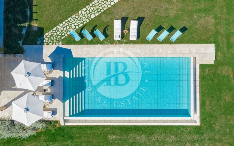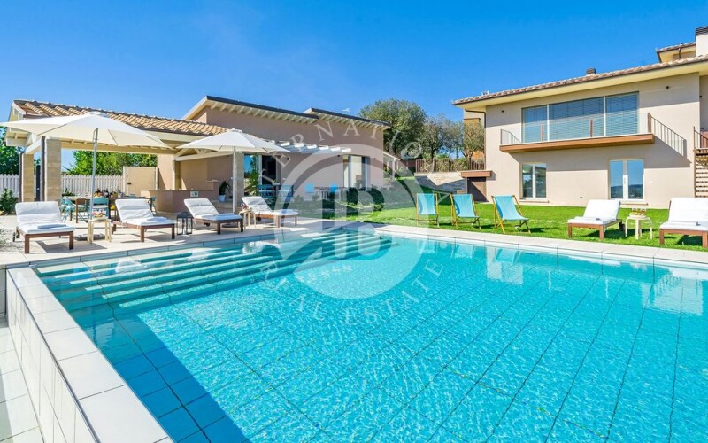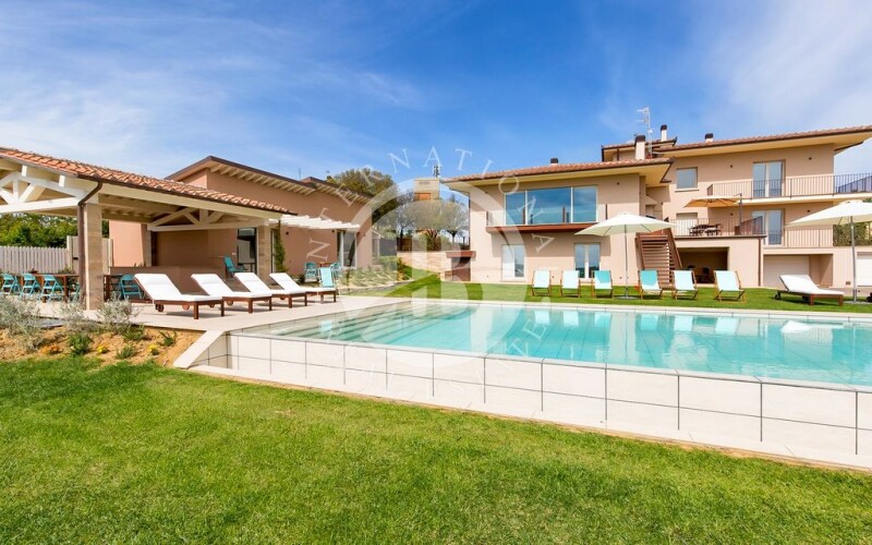Nestled among the olive groves of Valdichiana, this refined villa stands atop a hill in Foiano della Chiana, offering breathtaking panoramic views that stretch over 80 kilometers, encompassing Cortona, Castiglion Fiorentino, and the rolling valley below. An exclusive oasis blending modern comforts with natural materials, ensuring complete privacy and serenity. Spanning 465 sqm, the villa's interiors are designed for ultimate comfort and enriched with exquisite details. Seven bedrooms, each with an en-suite bathroom adorned in natural travertine, offer luxurious retreats. The four fully equipped kitchens are perfect for any occasion, ideal for culinary enthusiasts. Materials such as solid oak wood flooring and bespoke artisanal furnishings add warmth and sophistication to the spaces, which include bright living rooms, a relaxation area with a sauna and chromotherapy, and a central lounge that forms the heart of the residence. Surrounded by 50,000 sqm of land, the villa is immersed in centuries-old olive groves and meticulously landscaped Mediterranean gardens. The infinity-edge pool, heated and designed with non-slip materials, is a contemporary masterpiece perfectly integrated into the natural surroundings. Expansive outdoor areas, including patios and barbecue spaces with a wood-fired oven, are ideal for al fresco dining and entertainment. From the terraces and gardens, enjoy spectacular panoramic views extending up to 80 kilometers, offering unforgettable sunsets and a deep connection to Tuscany’s beauty. The villa is equipped with cutting-edge technology: controlled mechanical ventilation, solar panels, and a 10.78 kW photovoltaic system. Each room features autonomous climate control, ensuring maximum comfort throughout the year. LED lighting and windows with integrated blinds provide seamless functionality and aesthetic appeal. An independent annex enhances the property, while a garage and ample parking spaces complete the amenities. Foiano della Chiana, in the heart of Valdichiana, is a prime example of medieval urban planning with a Renaissance historic center rich in art. It lies on the Strada del Vino Terre di Arezzo, a wine route that showcases the region's DOC wines and culinary delights. Its strategic location offers easy access to art cities like Montepulciano, Pienza, and Arezzo. Foiano della Chiana 1,4 km Montepulciano 19 km Pienza 30 km Arezzo 40 km Florence’s Airport 109 km.
