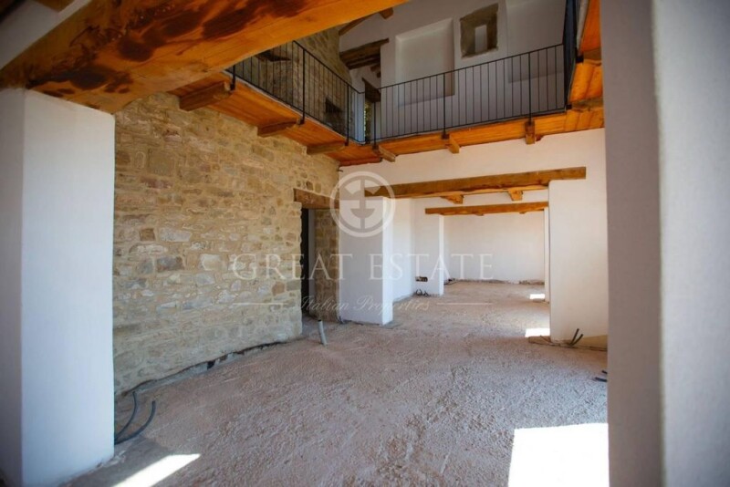 Exclusive property in the municipality of Città di Castello, consisting of a main farmhouse on two levels, in course of renovation, with an annex with the possibility of being used as a guest house. The property has been already prepared for the construction of the garden, partially terraced, and for a swimming pool with already existing project. The property is located in a hilly position, 500 meters above sea level with a beautiful view that extends 360 degrees onto the Nestore Valley. Casale la Valle is located in a fantastic place, in a dominant position and in harmony with the surrounding environment. The property stands within the wonderful landscape context of the Umbrian countryside. The farmhouse covers an area of approximately 440 sqm spread over 2 levels and internally arranged as follows: On the ground floor a wonderful living area with a particular ceiling in the center in which a gallery corridor has been installed which follows the four walls, on the first a living area and three bedrooms with ensuite bathroom with a breathtaking view. There is an annex of approximately 40 sqm, which could be used as a guest house. The land of approximately 2.3 hectares has already been partially prepared for the construction of the garden and swimming pool, with an existing project and related illustrative rendering. State of repair The structure was created by the union of two farmhouses. In the construction of the farmhouse, old stones were used on the outside for the historic rough coat to create a building that resembles a typical farmhouse; In the interior, beams and rafters were installed, as well as old stones for the architraves. The loggia with arches from which you can enjoy a breathtaking view is typical. Everything was created following current anti-seismic regulations and also according to the most modern livability requirements. The structure has been completed. The building is built in a rustic style with plasters made and all the systems set up. The completion of the finishing of floors, walls, fixtures, etc. is left to the care of the customer so that they can customize the home according to their own tastes and needs. The price refers to the turn-key solution. Utilities The property is served by a private well and an electricity line. Use and Potential Uses This charming property will be a magnificent private luxury residence to spend your holidays in one of the most beautiful areas of Umbria. However, the property would also be suitable for high-level representation purposes or even for use as a main residence, to be lived in all year round, thanks to its truly comfortable spaces. A very attractive alternative could be to include the property in the luxury tourist rental circuits, thus being able to obtain optimal profitability. Location Immersed in woods, cultivated fields and olive groves with very suggestive views, it can be reached via approximately 4 km of perfectly maintained dirt road. The nearest town with services is 5 km away. It is located halfway between Città di Castello (26 km) and Trestina (18 km) with the great advantage of being about twenty minutes by car from the border of Tuscany. Land registry details The Great Estate group carries out a technical due diligence on each property acquired through the seller's technician, which allows us to know in detail the urban and cadastral status of the property. This due diligence may be requested by the client at the time of a real interest in the property. Ownership details and eventual contractual obligations This property is registered in the name of a company, the sale will be subject to registration tax according to current regulations (see purchase costs from the manufacturer) the price shown is turnkey.