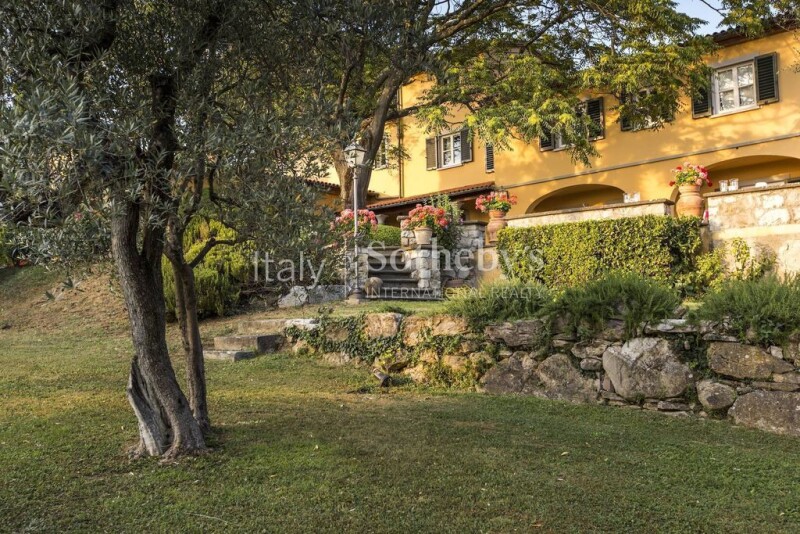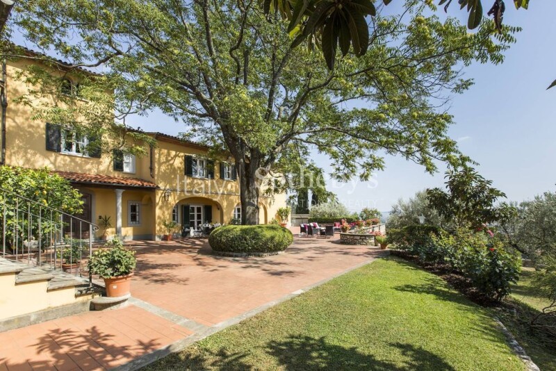Elegant Villa of 550 m2 located on the hills of a prestigious residential area. The property has a large park of about 3,000 m2 with lush olive trees, a large swimming pool and a panoramic terrace overlooking the city of Prato, Florence and Pistoia. The main door leads to the ground floor, where we find an arch supported by two columns that leads us to the living area: on the right we find a large dining room followed by a large kitchen with custom-made marble countertops, lacquered furniture and motifs flowers on the walls. Beyond the kitchen we find the laundry room, the room for the servants and the garage with two parking spaces equipped with an internal alarm. Still on the ground floor, but on the left, we find a large living room with fireplace, crystal bookcase, TV room and a lovely guest bathroom. The sleeping area awaits us on the first floor: two bedrooms with marble bathroom with shower, a double bedroom with bathroom with pink marble tub and shower, and the master bedroom with walk-in closet and marble bathroom with shower and Jacuzzi. Going up one more floor we find the habitable attic, an ideal place to retire in peace. The house is built with luxury materials: ceilings with chestnut wood beams, marble, sandstone, terracotta, fine parquet. The rooms are equipped with air conditioning. The strategic position allows both walks along the country paths on foot or by bicycle, and quick access to the Prato railway station which can be reached in 5 minutes; the highway is 10 minutes away by car, and near by the property it is possible to play golf or tennis in one of the prestigious clubs of the area.