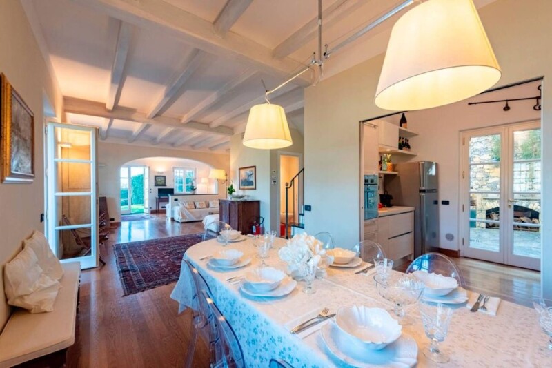Experience Timeless Elegance on the Italian Riviera Are you ready to embrace La Dolce Vita in one of Italy’s most iconic coastal destinations? Nestled in the tranquil hills above Santa Margherita Ligure, this stunning villa offers the perfect blend of privacy, comfort, and panoramic views—just minutes from the vibrant heart of the Riviera. Only a 6-minute drive from the center of “Santa” and 5 km from the glamorous shores of Portofino, this residence is ideally situated for both holiday escapes and full-time living. With Genoa Airport just 40 km away, international access is effortless. Indoor Space: 350 sq. m. (approx.) Outdoor Space: 2000 sq. m. The Main House Designed with meticulous attention to detail, the main residence is in move-in condition and features an open-concept living, dining, and lounge area bathed in natural light. French doors lead directly to a lush garden and covered outdoor dining terrace—perfect for alfresco entertaining. The well-appointed kitchen can be enclosed with a sliding door or left open to the dining area, and connects seamlessly to the outdoor kitchen, complete with pizza oven, BBQ, and gas hookup—a true entertainer’s dream. A guest powder room, cozy fireplace, and full air-conditioning complete the main floor Outdoor Living Set across multiple terraced levels, the garden is a Mediterranean sanctuary filled with olive and citrus trees, framing breathtaking views of the Ligurian Sea and the picturesque town below. The lower garden features a swimming pool, stylish outdoor lounge, and a bocce/basketball court—a haven for relaxation and recreation.Upstairs Living The master suite offers a serene retreat with a private shaded terrace overlooking the sea and a luxurious ensuite bathroom. Two additional double bedrooms with garden views share a spacious bathroom with both bathtub and shower. All bedrooms are air-conditioned for year-round comfort. Lower Level & Amenities The lower level includes a guest bedroom, full bathroom, and generous storage space. The garage has been transformed into a games room/gym, though it can easily revert to covered parking. There is additional parking in the driveway, as well as other owned spaces on the road. Charming Guest House Separate from the main residence, the guest house is a delightful, self-contained unit with a romantic living space, fully equipped kitchen, and downstairs double bedroom with garden access. A second small room and a full bathroom with shower complete the layout. Both levels are air-conditioned. Peace, Privacy & Prestige Situated in a quiet residential enclave surrounded by elegant villas, this property offers the perfect balance of seclusion and accessibility. While the villa shares a garden wall with a neighboring home, the entire property is fenced and completely private. Highlights at a Glance – Spectacular sea views from multiple levels – Indoor & outdoor kitchens with premium amenities – Swimming pool, basket ball and bocce pitch in the lush Mediterranean garden – Air-conditioning throughout – Garage/gym, storage, and multiple parking spaces – Independent guest house – Just minutes from Santa Margherita, Portofino, and Genoa Airport.
