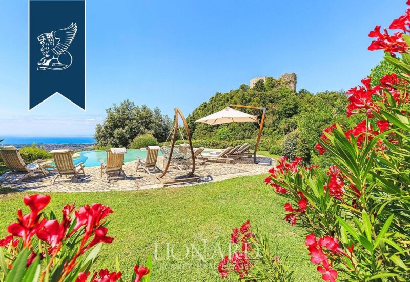 In Montignoso, on the hills facing the stunning Aghinolfi Castle, there is this prestigious Tuscan property for sale, just ten minutes from Forte dei Marmi. Fascinating and majestic, this property is surrounded by a large, leafy park of 6,500 sqm, home to a very panoramic heated swimming pool, itself surrounded by the typically local lush vineyards that alternate with centuries-old olive trees. This prestigious recently built estate, 500 sqm of pure elegance in a rustic style, recreates a sophisticated but essential atmosphere in its rooms, with echoes to the past. The classic taste in the choice of furniture meets the latest comforts to offer the best living experience; among these, a convenient lift that reaches all five floors, including the panoramic rooftop. The ground floor, overlooking a splendid external veranda, houses a spacious living room that flanks a dining room and a kitchen. On this floor there is also a bedroom and a bathroom. On the first floor, the sleeping area is divided into five en-suite bedrooms, a relaxation room with a reading corner, and a big balcony. Another bedroom with a bathroom is located at basement level. Ref: 6291.