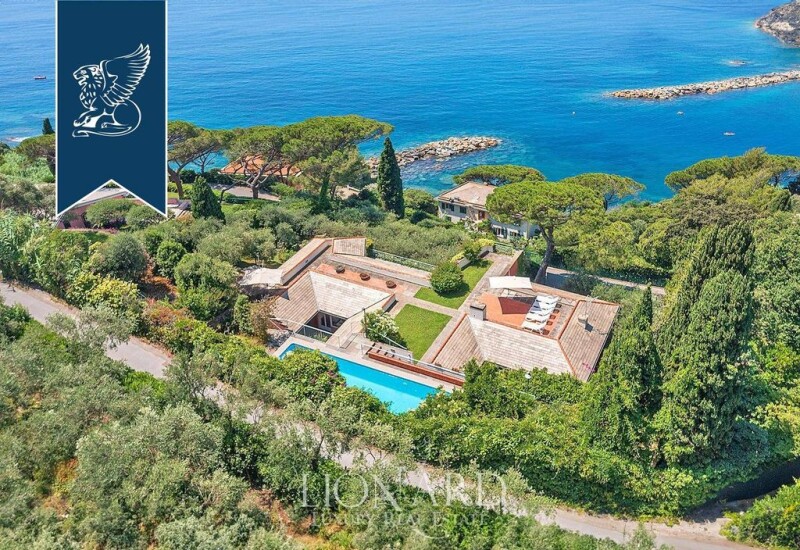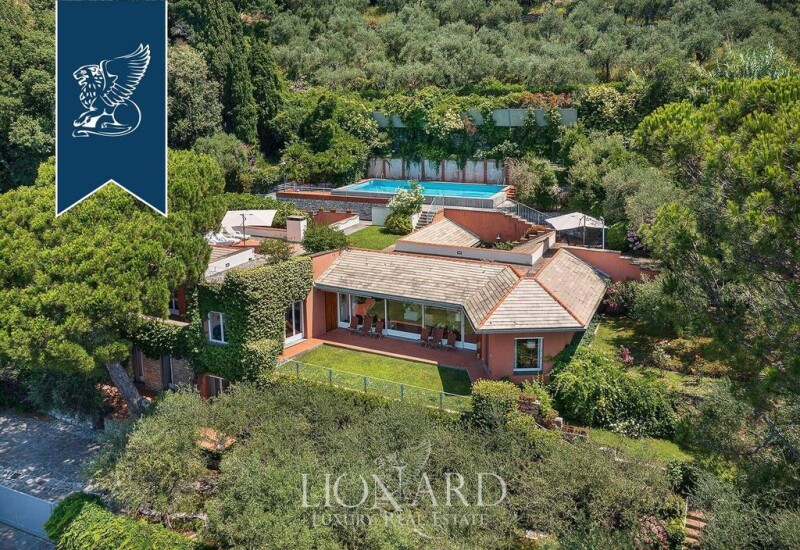 This exquisite villa in Sestri Levante, designed by renowned architect Alberto Mazzoni in the 1960s, is an architectural gem nestled in Mediterranean greenery with panoramic bay views. Covering 460 sqm, the villa seamlessly blends indoor and outdoor spaces, surrounded by over 2,000 sqm of terraced gardens rich in olive trees and lush vegetation. The property features spacious terraces, a swimming pool, and an environment of complete privacy and tranquility overlooking the sea. Located in Sestri Levante, known as the "City of the Two Seas" for its unique bay formations, the villa benefits from the area's stunning coastal beauty and rich history. The design, inspired by Frank Lloyd Wright, emphasizes harmony with nature, integrating airy, light-filled interiors with the surrounding landscape. Spread over two levels, the villa includes a triple living room with sea views, a dining room, a kitchen, a study, three bedrooms, and four bathrooms on the upper floor. The lower level features additional bedrooms, bathrooms, and storage. The property also offers a panoramic garden, terraces, a swimming pool, and private parking, making it a luxurious retreat in a coveted location. Ref: 13072.