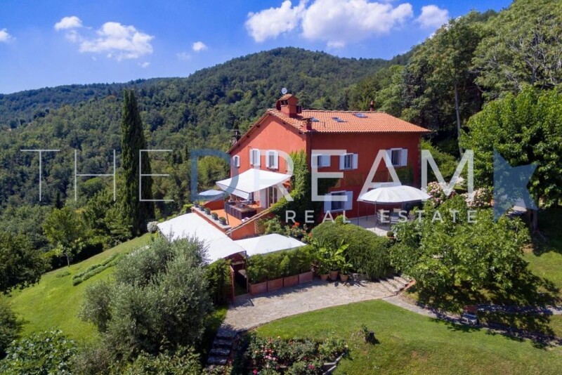 LOCATION Villa Ginestra, located in the Florentine hills, offers a splendid panoramic view in a quiet and green area located just a short distance from the center of Florence. The location offers a breathtaking per-spective on a typically Tuscan landscape, with expanses of olive groves and vineyards that extend towards the horizon. Villa Ginestra dates back to the 13th century and was originally built as a watch-tower, hence its unique location. This hilly area is an ideal refuge for those seeking natural beauty and tranquility, while maintaining easy access to Florence and the main roads. The privileged location also offers the convenience of reaching the major attractions of Tuscany such as Chianti, Siena, Montepulciano, Val d'Orcia and Pisa. OUTDOOR SPACE The outdoor area of this magnificent villa represents a perfect balance between nature and refinement, offering an oasis of total privacy immersed in an extraordinary landscape. Surrounded by about 7 hectares of land, between olive groves and a carefully tended garden, the property is distinguished by the richness of plants and vegetation, which give a touch of color and harmony to the entire environment. Villa Ginestra, with its elegant pastel red facades, blends perfectly into the surrounding landscape, creating an impeccable blend of architecture and nature. The jewel of this property is a beautiful saltwater pool that allows you to enjoy moments of relaxation on hot days. The open scenery offers an uninterrupted panoramic view that extends towards the horizon, giving those who stay a feeling of peace and serenity unique, while remaining a short distance from Florence. INTERIOR LAYOUT Ground floor: a patio, a dining room and a living room with an old fireplace, a terrace with solarium, a bathroom, a kitchen and a technical room. First Floor: two double bedrooms, a single room with en-suite bathroom, a suite with bath arranged with jacuzzi and walk-in closet, an independent bathroom with bathtub. Attic: an attic Dependance: independent entrance, double bed, living room with fireplace, bathroom with shower and private patio. FINISHES Villa Ginestra’s finishes are an expression of refined luxury, with meticulous attention to every detail. The sandstone flooring gives elegance and solidity to the interior spaces, while the original wooden beams enhance the authentic character and rustic charm of the villa. The walls, finished with Venetian plaster in delicate pastel tones, add a touch of sophisticated lightness, giving warmth and harmony to the environment. The bathrooms, real design jewels, are embellished with finishes in precious pink marble Portugal, an exclusive material that further enriches the distinctive character of the property.
