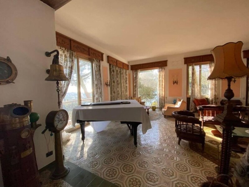 The Royal Villa of Lerici (Golfo dei Poeti) The Royal Villa, built in the late 1970s, stands on the top of a gentle hill above the village of Lerici and is surrounded by the typical Mediterranean scrub. The splendid Villa enjoys a magnificent panorama over the entire Gulf of Poets from the bay of Lerici to the islands that frame the Gulf, to Portovenere to the south-west and, to the east, the view extends towards the Sarzana basin and the Apuan Alps. Floors of hand-painted Vietri ceramics, wrought iron balustrades and lampposts from Barcelona, an exciting view and large internal and external spaces are just some of the characteristics of this beautiful residence. The Villa consists of a ground floor and first floor , plus flat roof terrace with service apartment in the attic; in addition, the cellars, rumpus room and garage are located in the basement. The two floors of the house are divided into two separate apartments and connected by a practical internal lift, which breaks down architectural barriers starting from the garage. The floor land, approx. 200 m2 comprises entrance hall, large living room with wardrobe, large double bedroom, living room with cooking area and dining area, large room in a corner position with four panoramic French windows, bathroom. From an internal marble staircase Botticino leads to the first floor, of about 245 m2, consisting of a large entrance hall, study with balcony, large double bedroom with stucco decorations and balcony, eat-in kitchen with direct access to the rear part of the park, 85 m2 living room with dining area, bar and conversation area, long panoramic terrace and garden at floor level. The floor is completed by a small sitting room-study (furnished like a Tyrolean stube!), a bathroom, a bathroom with shower and a small wardrobe space. Through the garden and an external staircase one reaches the large flat roof terrace and a attic consisting of a spacious central room (which can be used as a service or hobby room) and two small rooms which house the lift motor and a small bathroom. The Villa is surrounded by large surfaces paved in Dutch stone, which invite you to "inhabit" the garden and which allow easy access to all levels of the park and make the various levels of the same independent. The park, of about 1000 square meters, includes in the upstream part, a to a comfortable staircase ending with a paved rotunda, in the summer it allows a cool and pleasant usability... like a real cool and refreshment place from the summer heat. At street level, a garage was built with two convenient parking spaces. The lift serves all floors of the villa. On the upper semi-basement floor there is, on one side, a large service cellar; on the other (with external entrance from the terrace above the garage) a characteristic rumpus room divided into two rooms finished with original solutions.