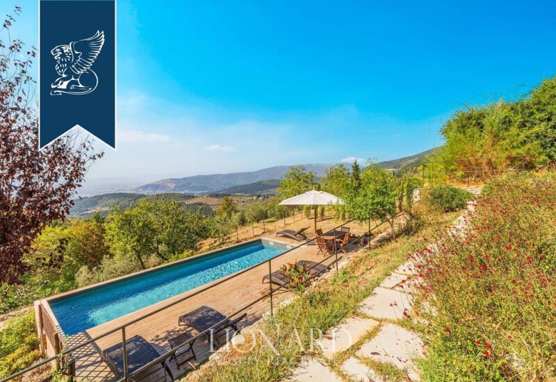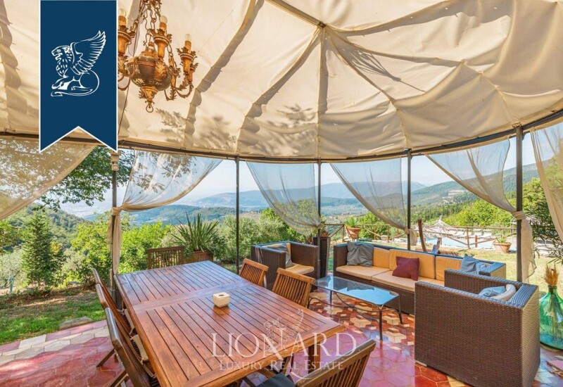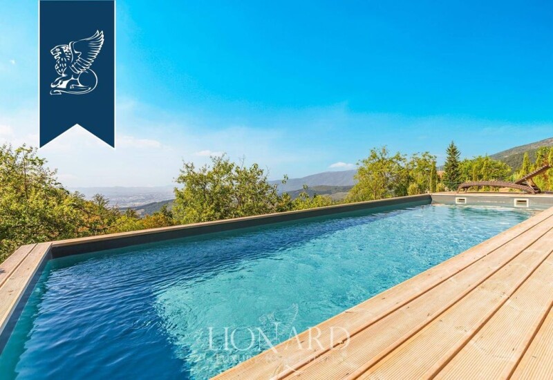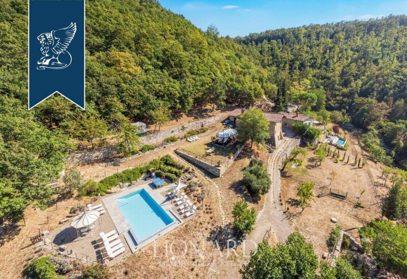 A few steps from Florence, this is found for sale this, immersed in the wonderful forest of the Monte Morello Nature Reserve, this magnificent panoramic estate of 800 square meters with private park of 80000 square meters, two swimming pools, Swedish sauna and panoramic whirlpool is on sale. The estate consists of three fascinating panoramic villas, characterized by the typical architecture of the Tuscan countryside, with visible stone bricks, Florentine terracotta roofs and walls covered with climbing plants. The main property is obtained from a convent of the thirteenth century, of which it still retains the intimate and magical atmosphere, and consists of 4 apartments developed on three floors. The second structure, obtained from the old stable of the farmhouse, has been reconstructed in contemporary style and consists of three independent double suites, with private bathroom and panoramic terrace. The exteriors of these two properties are enriched by a splendid and large touch swimming pool with equipped solarium, by a Swedish sauna and a whirlpool tank. The third farmhouse of the property was obtained from the renovation of the barn and is divided into two apartments. Outside we find a large private garden with Sunset Lounge and veranda with a pergola light lunch area covered with wonderful climbing. Ref. 11164.