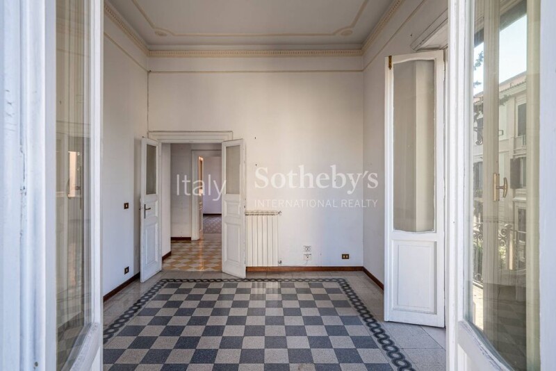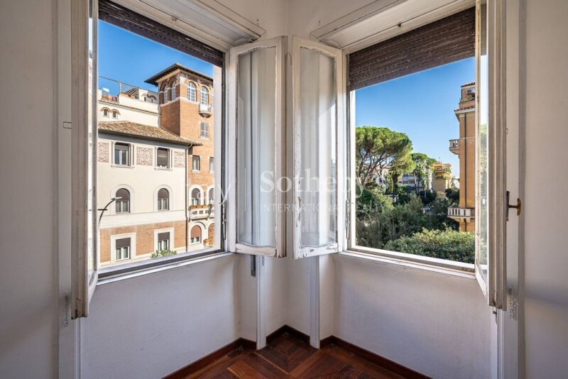 In one of the most elegant and sought-after streets in Parioli, home of some of the most iconic residential buildings of the early 20th century, this bright apartment occupies part of the second floor of Palazzo Sacripante, a symbol of refined 1920s architecture designed by architect Vittorio Cafiero. This prestigious four-bedroom apartment, complete with lift, boasts a rare four-sided exposure and retains its original, distinctive features, including painted cement tile flooring, period cast-iron radiators, and beautifully decorated ceilings. Currently, the apartment comprises an entrance hall, a double living room, a separate dining room, kitchen. The hallway leads to the night are with bedrooms and two bathrooms. The apartment benefits from abundant natural light, courtesy of its 360° exposure, offering views of lush greenery and elegant residences. It also boasts a semi-perimetral balcony providing a small outdoor space, exclusive internal parking options in the condominium garden-features that are exceptionally rare in central Rome. A unique opportunity for a renovation that can blend historical charm with contemporary functionality, adapting to any taste or need. Ideal for those seeking a prestigious residence or a representation space. Very well connected to both the historic centre and major museums, Parioli is a desirable district also for high quality services, international schools and universities as well as the major embassies. The elegance of the neighborhood, the historical significance of the building, combined with the strategic and central location, make this purchase an exceptional investment opportunity.
