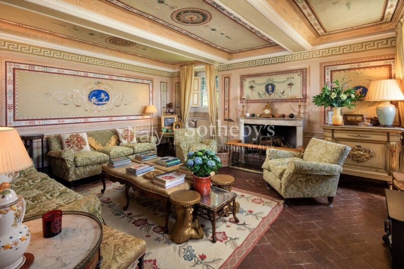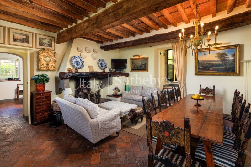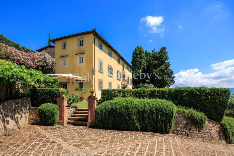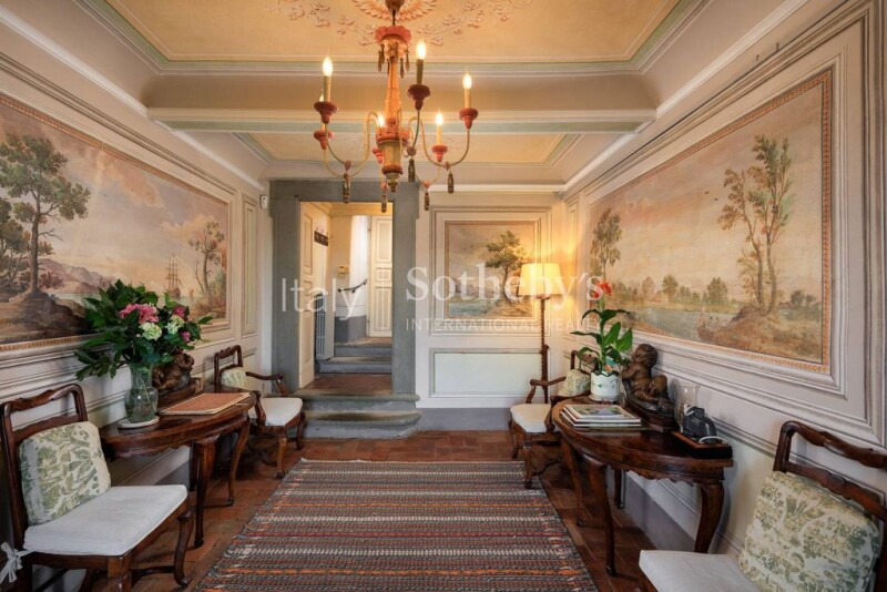 In one of the most exclusive areas of Lucca, situated on a hill with a panoramic view of the surrounding countryside and the towers of the ancient medieval city, lies this beautiful historic villa dating back to the early 18th century. The villa comes with a pool and three hectares of land, mostly cultivated with olive trees. The ancient villa, approximately 550 sq. m. in size, spans three levels and its interiors still retain the original frescoes in perfect condition. The painted walls of the villa are its unique feature, with varied landscapes, figurative scenes, decorations, and motifs adorning every room from the walls to the ceiling. The ground floor consists of a spacious entrance hall, a living room with a beautiful marble fireplace, a dining room with a seating area and another large fireplace, a wardrobe, a bathroom, a kitchen, and a laundry room. The first floor includes a library/lounge, a master bedroom with a large walk-in closet and en-suite bathroom, a double bedroom, a bathroom, and access to the private chapel, which can also be accessed from the outside. The second floor hosts a double bedroom with an en-suite bathroom, three double bedrooms, and two bathrooms. The property is completed by a charming and well-maintained Italian garden, a separate stone building with a bathroom and storage area, and a 12 x 6 m pool located right in the middle of the olive grove, offering breathtaking views over the entire valley.
