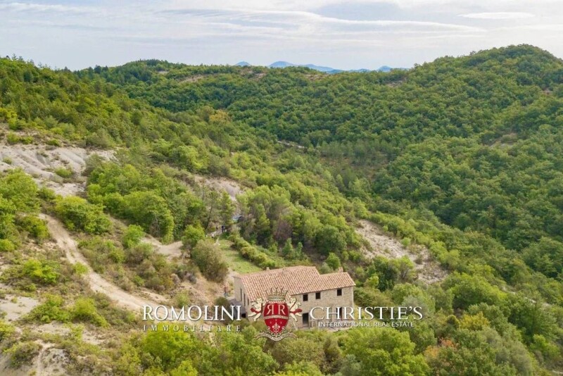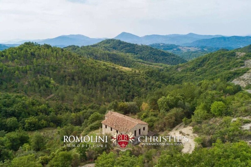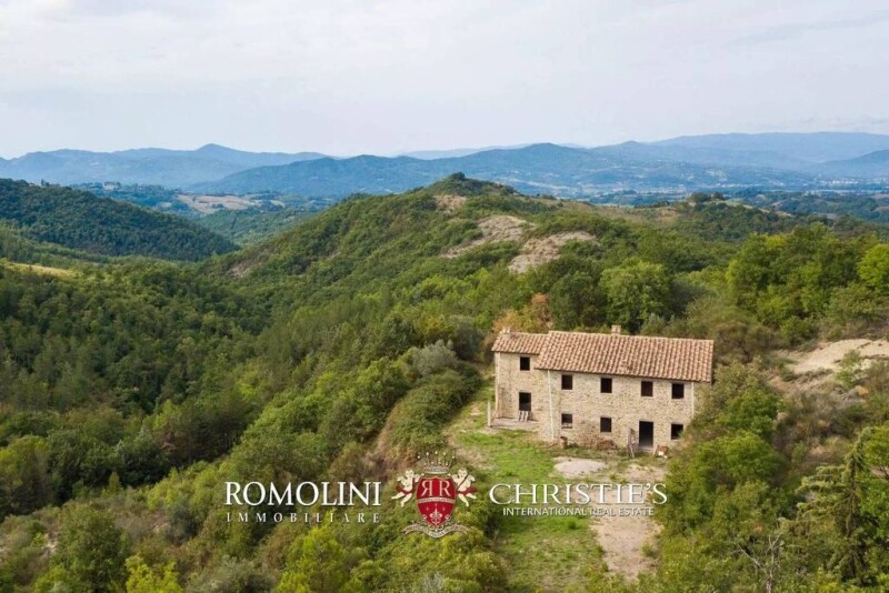 On the hills of the Tiber Valley, between Montone and Città di Castello, farmhouse to be restored with 8.5 hectares of land. The building has been consolidated and only needs internal finishing work: the current project envisages the creation of 4 bedrooms and 6 bathrooms in addition to a spacious living area on the ground floor. The land around the building (approx. 1,000 sqm) offers sufficient space for the creation of a panoramic garden, and the coppice could provide wood for heating at a reduced cost. The property can be reached via an unpaved road (1.4 km) that connects directly to the municipal road system, and the medieval town of Montone is just a 10' drive from the farmhouse: all basic services can be found there. The most notable cities of Tuscany and Umbria are within driving distance (Umbertide, Città di Castello, Sansepolcro, Perugia, Cortona, Siena, Florence...). DESCRIPTION OF THE BUILDINGS, STATE AND FINISHES The farmhouse (280 sqm – 3,013 sqft, 4 bedrooms and 6 bathrooms) is currently in builder’s finish, with consolidation work and re-roofing completed in recent years. There is already a renovation project for the distribution of the interior spaces that envisages the living area on the ground floor and the sleeping area on the first floor. Entering from the loggia on the ground floor, one finds oneself in a large living room with dining area and exit to a second loggia on the ground floor. From the living room one passes to the kitchen (also with exit to the backside loggia) and to the central hallway that leads to the main bathroom and to the laundry room with service bathroom and storage. With independent access from the outside one then finds a cellar/storage room and a storage room that doubles as a cavity to protect the house from moisture. Going up to the first floor, via either an internal or external staircase, we reach the sleeping area consisting of three bedrooms with en-suite bathroom, a small office space and a bedroom with bathroom in the corridor. The office space could, in any case, be used as a children's bedroom. EXTERIORS The farmhouse is surrounded by approximately 8.5 hectares (21.1 acres) of hilly land. Around the building are approximately 1,000 sqm of flat land that could be converted, once the work on the house is finished, into a beautiful garden with views over the valley below. Moving away from the farmhouse we then find woodland (5.4 ha mostly registered as coppice) and open land with pastures and arable land (3.0 ha). CLOSEST CITIES AND TOWNS Montone (4km; 10’), Umbertide (12km; 20’), Città di Castello (25km; 30’), Gubbio (35km; 45’), Sansepolcro (38km; 40’), Tuoro sul Trasimeno (41km; 50’), Perugia (44km; 45’), Cortona (48km; 1h), Castiglion Fiorentino (51km; 1h 5’), Assisi (61km; 55’), Todi (85km; 1h 10’), Pienza (107km; 1h 45’), Montalcino (126km; 2h), Siena (131km; 1h 50’), Florence (138km; 2h), RoEa (211km; 2h 40’) CLOSEST AIRPORTS Perugia San Francesco (44km; 45’), Rimini F. Fellini (141km; 2h 10’), Ancona R. Sanzio (146km; 1h 55’), Firenze A. Vespucci (155km; 2h), Bologna G. Marconi (215km; 2h 40’), Pisa G. Galilei (216km; 2h 45’), Roma Ciampino (225km; 2h 35’), Roma Fiumicino (239km; 2h 45’).