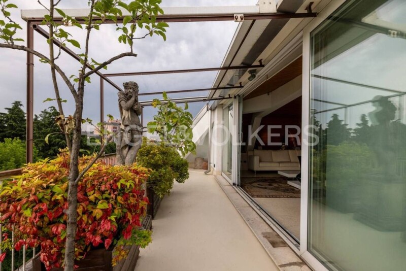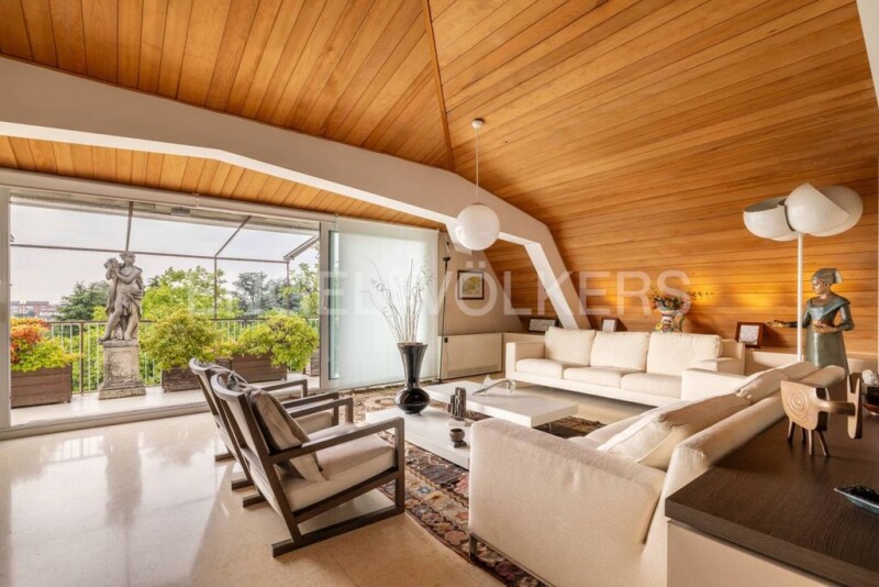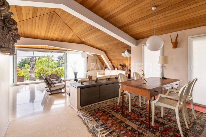 In Gallarate, near the city center, we offer for exclusive sale a wonderful penthouse with a refined and elegant design. Located on the top floor of a 1970s building, you wouldn't expect to be astonished and somewhat dazzled by the care and simplicity that characterized the renovation upon crossing the threshold. The warm colors of beige and brown dominate, enveloping you in a warm feeling of well-being. The main entrance leads to the hallway, which guides you to the triple living room, intentionally reminiscent of a ship's bow, consisting of a study area with a furnished terrace, a large conversation area, and a dining area. New generation sliding French doors facilitate the diffusion of light and allow access to the terrace. The spacious and well-arranged kitchen is adjacent to a bedroom and a bathroom. The sleeping area, accessible from the same hallway that leads to the living area, consists of two double bedrooms with en-suite bathrooms, both equipped with walk-in closets. Additionally, there is a small bedroom that can also be used as a study. All the French doors in the sleeping area provide access to a long and wide balcony with a wonderful view of Monterosa. The property is enriched by a cellar, a single garage, and a parking space located in another nearby building.