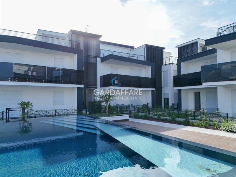 Peschiera del Garda, LAKE VIEW PENTHOUSE WITH THREE DOUBLE BEDROOMS AND DOUBLE GARAGE! In San Benedetto in proximity to the lake and all services, we propose NEW FOUR-ROOM ATTIC WITH LAKE VIEW and LARGE GARAGE. The luxurious property is spread over two floors and is part of an Exclusive Residence of only 18 units with Infinity Pool. The solution is excellent as a First Home or Holiday Home. On the second floor the apartment consists of entrance hall, large living room with kitchen, covered terrace, hallway, first bathroom, two double bedrooms LAKE VIEW, one of which has an exclusive balcony LAKE VIEW. Through an internal staircase leads to the second floor (SUNDECK or SUPERATTIC) where we find a large double bedroom LAKE VIEW, second bathroom with bathtub LAKE VIEW, two terraces, one of which is arranged for a private Jacuzzi and a technical room. A double garage completes the property. Sun exposure living room South-West and rooms North - East. The project has ultra-modern architectural design, top quality finishes, numerous accessories such as: Photovoltaic panels for condominium management, Bticino electrical system, home automation, Samsung Free Wind air conditioning system, VMC system, underfloor heating with heat pump, aluminum/wood burglar-resistant window frames, Prima Scelta90 x 90 porcelain tiles, 120 x60 bathroom tiles, ECLISSE flush or sliding interior doors, illuminated suspended ceilings, LED lighting system, thermostats in all rooms, Flaminia wall-mounted faucets, New Form faucets, Ercole digital-opening security door, wood and porcelain floors, automatic garage lock, possibility of wall-mounted box for charging electric cars. Energy class 'A4'. Price Euro 950,000 + VAT GARDAFFARE: 030/9905461. ref. 23-30.