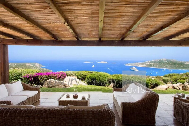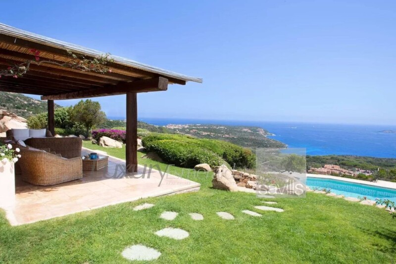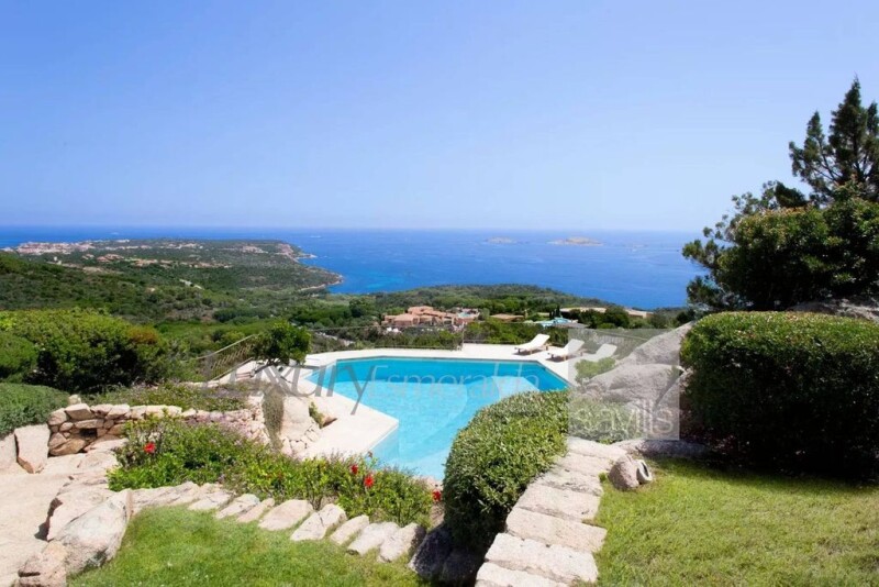 Villa For sale Pantogia Porto Cervo: This magnificent designer residence, conceived by the Archistar Luigi Vietti, is for sale in the renowned Costa Smeralda, near Porto Cervo, one of the most enchanting places in the world. This luxury masterpiece, born from the creative talent of Luigi Vietti, a renowned architect involved in the design of Porto Cervo in the 1960s, spans multiple levels, embracing a splendid garden of over 5000 square meters enriched by a panoramic swimming pool overlooking the crystalline waters of Sardinia. As one of the founders of the Yacht Club Costa Smeralda, the architect Luigi Vietti was chosen in the 1960s by Prince Karim Aga Khan IV to participate in the design of the prestigious Costa Smeralda. His style, inspired by the Mediterranean, stands out for the use of harmonious volumes that blend seamlessly with the surrounding environment, recurring arches, clear plaster, and pastel tones. He is credited with the design of the village of Porto Cervo, the construction of renowned hotels, and numerous luxury villas, characterized by meticulous material selection and refined and exclusive architectural formulas. The designer residence for sale in Costa Smeralda is developed on two levels. The ground floor features a spacious and bright living room, complete with a charming relaxation corner featuring a majestic Sardinian-style fireplace. Through a large window, you access a refined veranda furnished with sofas and tables, from which you can admire an extraordinary sea view extending from Porto Cervo to the beaches of Golfo del Pevero. The heart of the home is represented by the living area, which includes a luminous dining room with a separate kitchen and a service area equipped with laundry facilities, and an additional staff bedroom with a private bathroom. To fully enjoy the panorama during meals and sheltered from the wind, there is a second outdoor dining area with a barbecue, accompanied by a guest bathroom. Through an open corridor on the opposite side of the living area, you access the sleeping area, consisting of 5 sea-view bedrooms, each with an en-suite bathroom and independent access. Upstairs, also with independent access, is the master suite of approximately 30 square meters, equipped with private facilities and large windows offering an incomparable sea view. The residence boasts prestigious finishes and materials, including original Cera Sarda tiles, Orosei marble, and terracotta floors. From the splendid veranda, you access, via a few steps, the panoramic area of the swimming pool, harmoniously integrated among the rocks and surrounded by a lush and flat green park rich in plants, flowers, and rocks, following the tradition of the Gallura landscape. The Mediterranean architectural style, with an outdoor patio, pathways, and panoramic viewpoints, has been designed to make the most of the outdoor spaces and offer a view of the sea from every angle. Completing this luxury property are 3 covered parking spaces and an electric gate. Thanks to its dominant position on a hill, this designer residence offers a panoramic view with a thousand shades: from the intense turquoise of the sea to the white of the rocky and granitic coasts shaped by the wind and waves, to the warm and green tones of the Mediterranean scrub, which, in the innermost areas of Gallura, transforms into lush oak and cork oak forests. The privileged location, the extreme attention to detail, and the stylish design signed by Archistar Vietti create a magical atmosphere in perfect harmony with the surrounding environment. The result is a unique opportunity for anyone seeking an absolutely exclusive luxury residence, just a stone’s throw from Porto Cervo, in the renowned Costa Smeralda, where land and sea merge in an unparalleled sensory experience.