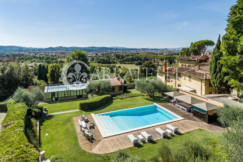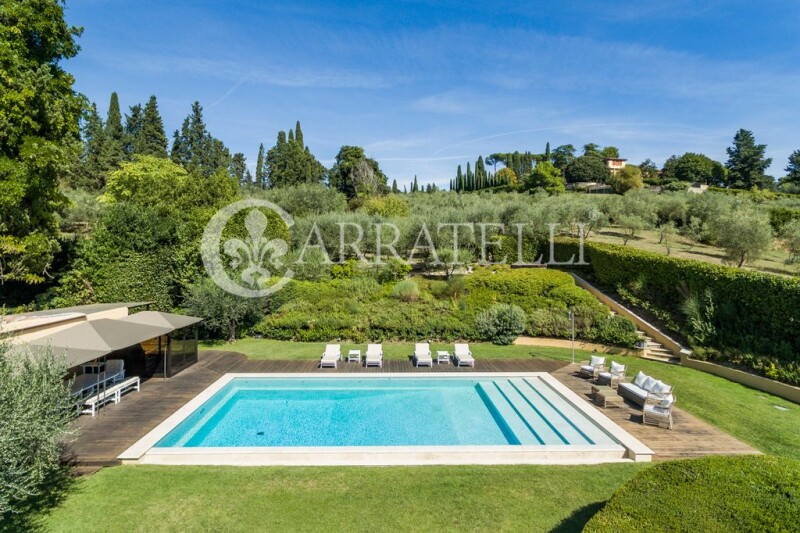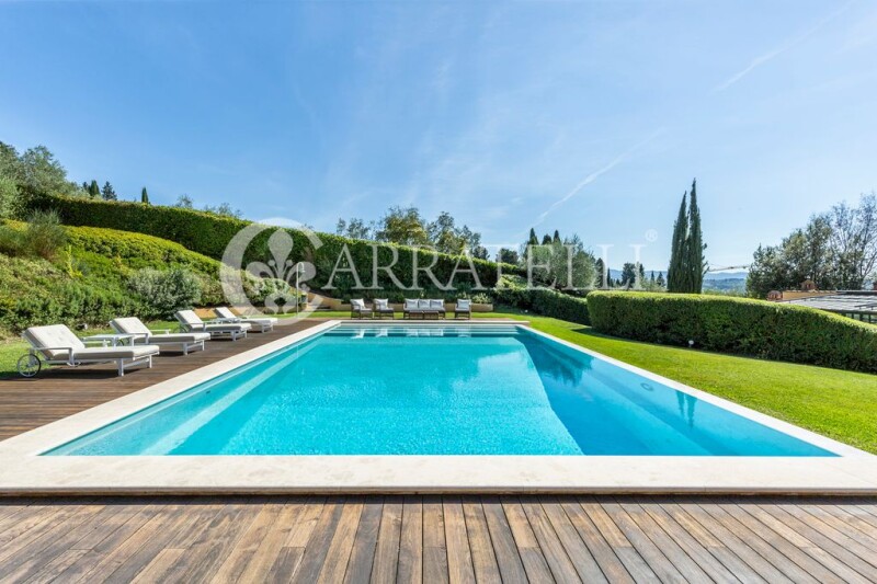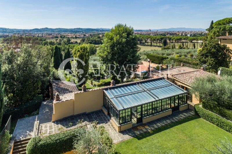 Extraordinary modern villa in one of the most prestigious and beautiful areas of Florence, just outside the chaos of historic center, where nature surrounds the property giving moments of true relaxation and tranquility to those who are there. Proximity to services, other prestigious villas and many areas for relaxation and recreation frame this home. Description Wonderful modern villa of 880sqm, in its time a lemon house, which was completely renovated in 2013 with idea to capture every ray of sunshine thanks to the large windows with integrated wooden blinds, built on a rectangular plan with 2 large bodies connected by a glass gallery that houses the dining area. In the main part of the villa there are 5 bedrooms and 4 bathrooms, a fully equipped kitchen, large living room with large windows and double doors leading directly to an outdoor terrace and gardens. The living room leads to a library with a study and second living area with a fireplace. A staircase leads to the second floor where there is master bedroom with private bathroom and 3 other double bedrooms with bathrooms. In the second part of the property there is a main entrance from the main road with a bedroom and bathroom and a separate apartment for guests or service persons. In addition additional living room and study. On the upper level of the property is a large fully equipped gym area, beautiful SPA area with hammam and a service area. Outdoor Spaces Nestled in 1000sqm of manicured garden with lemon and olive trees and stunning views of Florence, this former lemon house also has a large travertine swimming pool plus a Jacuzzi, a bocce court in the upper garden. The property also includes a huge garage for 5 cars with direct access to the villa fully automated. Condition and Finishes The entire property, private and gated, was designed by a renowned landscape architect and interior designer; the materials are of excellent quality and it is in perfect condition, perimeter alarm and CCTV cameras for security. Every detail has been taken care of, large wood plank floors, marble bathrooms, top-of-the-line fixtures with wooden blinds. Potential uses Beautiful villa with views of Florence that can become a wonderful home for a large family just outside the historic center of Florence. Location Coverciano area, proximity to the famous hill of San Domenico and Fiesole, close to all services. The location is undoubtedly among the most desirable and prestigious in Florence; a very strategic position for those who love to enjoy nature but need to get to the center of the City in less than 20 minutes.