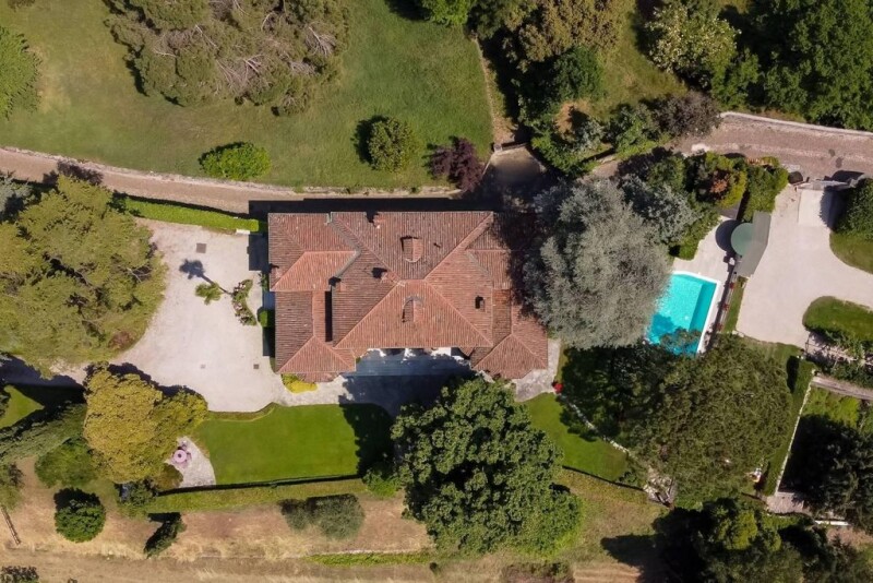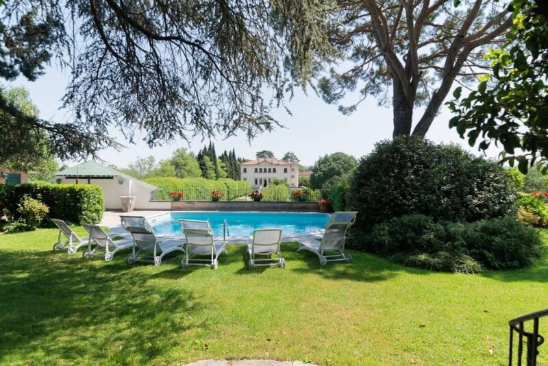 VICENZA Vicenza is widely, and not surprisingly, known as the city of Palladio. In this beautiful city rich in art and culture, ten minutes from the historic centre, we offer for sale this elegant residence which has always been loved and described by the owners themselves as a hearth of hospitality for relatives and friends. The elegant and prestigious context in the which it is immersed in, follows the simple refinement and linearity of Palladian lines. The location is enchanting, panoramic and quiet on the crest of the hill overlooking the Valletta del Silenzio, where various Palladian villas and the Sanctuary of Monte Berico stand. Living here gives peace and serenity to those who want to escape from the stress of everyday life. Due to its beauty and unique characteristics, the villa was recently used by Canale 5 for a successful drama, broadcast in prime time , with a high approval rating. The villa was completely rebuilt after the war destruction in 1943. Of beautiful and rational architecture, the distribution of the rooms highlights how they follow the rule of light, which enhances and caresses every corner of the house. The reconstruction, carried out in immediately after the war, it was designed by the architect Crespi. The villa is still very well preserved, having been constantly lived in and well maintained over the years, with a radical renovation carried out in recent years. It is spread over two living levels plus attic and basement with service rooms. The property is reached via an ancient path paved with local stones, on which the memory of the time when it was crossed by horse-drawn carriages resurfaces. A surrounding wall and an automated wrought iron gate delimit access to the villa , guaranteeing exceptional privacy. Through a panoramic driveway, which leads to the main entrance and a covered car park, you are surrounded by a garden covering approximately 6400 m2 in which shady centuries-old trees, such as cypresses, maritime pines and cedars of Lebanon, together with fragrant bushes of olea fragrans and roses, join with a slightly steep terrain which houses the vegetable garden for the cultivation of vegetables and fruit and a storage room for tools. On the border with the park of the famous Palladian villa Valmarana ai Nani, where you can admire the frescoes by Giambattista and Giandomenico Tiepolo, there is a functioning swimming pool equipped with a changing room and outdoor shower, at the edges of which you can enjoy a panoramic view of all the greenery surrounding the Valletta del Silenzio. THE VILLA Dimensions: m2. Approximately 910. GROUND FLOOR – A spacious entrance hall with a spiral staircase leading to the various floors, overlooking a large living room with fireplace and an adjoining dining room with lounge inserted in a bright bow window. Serving the dining area , a kitchen and other support services to those located in the basement. A large outdoor terrace, protected by an awning, hosts a further dining area which can be used on summer evenings to enjoy incomparable sunsets over the Valletta del Silenzio. Separated and overlooking the swimming pool and Villa Valmarana, a large suite with wardrobe and bathroom, as well as an exclusive private sitting room in the bow window. Overlooking the interior and in silence, a further bedroom with private bathroom. FIRST FLOOR - two twin bedrooms with exclusive bathroom as well as four bedrooms served by two bathrooms with shower and closet. ATTIC FLOOR - comfortable and composed of a double bedroom with wardrobe and bathroom. BASEMENT FLOOR - two large rooms used as a tavern and study, as well as a convivial area with kitchen, three cellars and numerous service rooms such as pantry, laundry room, servants' apartment with bathroom, and technical rooms for heating. Note: This sc--5be007b1a0e55904aa00e14a087d7e1c!.