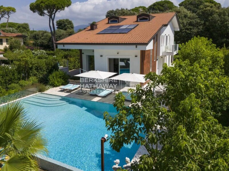 A stone's throw from the exclusive beaches of Versilia, in Marina di Pietrasanta, there is this modern luxury villa for sale. The property is of recent construction and is spread over two floors, with an internal surface of 350 sq. m. Around the house there is an enchanting garden of about 3,000 sq. me, with attention to detail, where there is a magnificent swimming pool with solarium that enjoys perfect lighting all day long and around which a luxuriant decorative Mediterranean scrub stands out. An elegant patio in front of the property entrance and adjacent to the swimming pool is a perfect outdoor living area, complete with garden furniture, spacious enough to set up outdoor dining surrounded by trees, palm trees, hedges and flower beds rich in Mediterranean essences. On the first floor, in correspondence with the patio, there is a beautiful terrace which is accessed via two French doors. The interiors of this dream home in Versilia, large and bright, are furnished with great simplicity and elegance and feature fine finishes that give class and exclusivity to the rooms. The living area, on the ground floor, consists of a large living room in shades of white and beige, characterized by precious marble. Then we find the dining room with French doors to the patio, a modern kitchen, a bedroom and a bathroom. On the first floor, accessed by a wooden staircase, there are five bedrooms with their respective bathrooms and two large balconies. Refined and full of comforts, this luxury villa for sale in Marina di Pietrasanta is ideal as a summer residence for pleasant holidays in the renowned Versilia, as well as perfect as a single-family villa to be lived in at any time of the year.