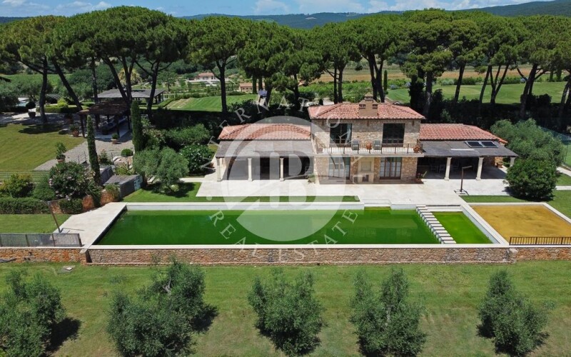 Surrounded by the green Tuscan countryside, this spectacular property is a short distance from the sea as well as some of the most renowned cities in Tuscany. A luxurious complex spanning 2745 square meters internally with 34 hectares of land, the property also has a swimming pool, tennis court, a private lake, olive groves and vineyards. This magnificent estate is comprised of five main buildings along with auxiliary facilities and various amenities. The main villa measures 714 square meters distributed over three levels and offers a range of communal spaces such as spacious lounges with fireplaces, a reception area, a restaurant with a fully equipped kitchen, and five bedrooms with en-suite bathrooms.There are two separate buildings, measuring 425 and 419 square meters respectively, which are dedicated to agritourism accommodation, each housing twelve bedrooms with en-suite bathrooms. There are two other structures measuring 289 and 235 square meters, which are used for recreational activities and spa treatments. Completing this elegant property is a wine cellar, a cinema room, facilities for olive oil production, a stable, service rooms, and ample parking spaces. This breathtaking property is surrounded by quintessentially picturesque Tuscan landscape. The vast expanse of the 34 hectares of the property is adorned with valleys of olive groves, vineyards and parkland. Twelve hectares of the land is situated within the main territory, while an additional 22 hectares, featuring fields and an olive grove with 500 trees, are located approximately 2.5 kilometers away towards the town of Massa Marittima. The main territory also includes approximately 2 hectares of vineyards, primarily cultivating Cabernet Sauvignon, along with 4.5 hectares of olive groves with around 1100 trees. An artificial lake measuring a half hectare is situated in the lower part of the property. The remaining land is designated for recreational facilities such as a tennis court, golf course, riding paddock, and also agricultural facilities for viticulture and olive harvesting. From the villa's terrace, one can enjoy panoramic views of the Tuscan countryside and the town of Massa Marittima in the distance. The property has recently undergone a meticulous renovation by the current owners who have transformed it into a rare jewel. The buildings showcase typical Tuscan features such as original stonework, wall paintings, frescoes and marble embellishments. This splendid complex offers an ideal retreat for those seeking the tranquility of the countryside without sacrificing the conveniences of modern amenities. Moreover, it presents a paradise for sports enthusiasts. The estate is located in the municipality of Massa Marittima, in the province of Grosseto. It is conveniently situated just a few kilometres from the pristine beaches of Maremma and within reasonable proximity to the major cities of Siena and Florence, as well as the renowned destinations of Chianti Classico. DISTANCES Valpiana – 2 km Massa Marittima – 8 km Follonica – 15 km. Punta Ala is in 30-minute drive away Pisa Airport 120 km.