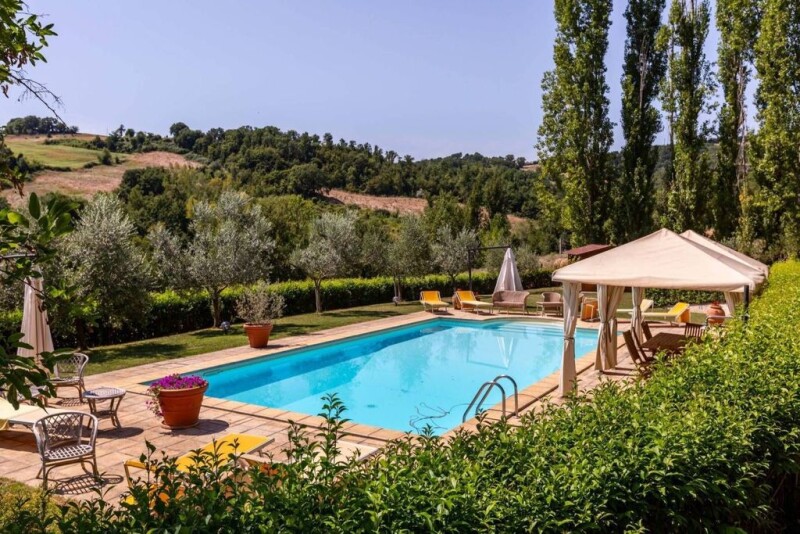 Località Camerata (PG) - Farmhouse for sale. Immersed in the greenery of the Umbrian countryside, a few minutes away from Todi and in a dominant position over the valley, stands this magnificent stone farmhouse with timeless charm. The structure, dating back to the end of the 19th century, was originally a small church with a parish house and a shelter for animals attached, and has been the subject of a careful conservative restoration which enhances its beauty and uniqueness. Arriving, you are immediately surrounded by the magic of this place; the quiet is absolute and the chaos of the city far away. This wonderful property is surrounded by approximately 5 hectares of land and a well-kept garden, where tall trees alternate with fruit trees and olive trees. In addition to the farmhouse, which is spread over three levels for a total of approximately 310 m2 and represents the main body, the property includes an annex of a further 100 m2. and a swimming pool, located lower down, in a private position. The view is unparalleled, the gaze is free to wander from any point of the property. The property presents the peculiar characteristics of the Umbrian houses of the time, such as terracotta floors, ceilings with wooden beams and stone walls. On the ground floor of the main body, a large entrance leads us into the living area, consisting of a large dining room, a beautiful built-in eat-in kitchen, created where the small church once stood and where it is still possible to see the apse, a double living room, a TV room, a bathroom and a technical area. Through a staircase we reach the first floor, where we find a sitting room with fireplace, a double bedroom with en-suite bathroom, two further double bedrooms served by a second bathroom and a study. Finally, continuing along the staircase, we reach the last level consisting of a turret, where we find another bedroom and a bathroom. From this point the view is truly unparalleled and each window seems to frame the surrounding landscape, as if it were a precious painting. Inside the annex we find a large living area with fireplace and two large double bedrooms with en-suite bathrooms. Adjacent to this structure there is an ancient wood-burning oven, used in the past by the inhabitants of the countryside and still fully functional. Going down a staircase protected by a fence we reach a beautiful swimming pool, surrounded by lush vegetation and perfectly integrated into the context of this splendid property. This elegant residence with timeless charm represents the ideal solution for all those looking for an oasis of tranquility in a context of absolute privacy just a stone's throw from Rome.