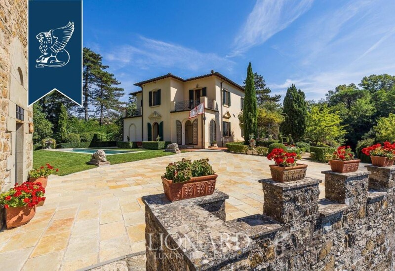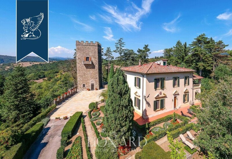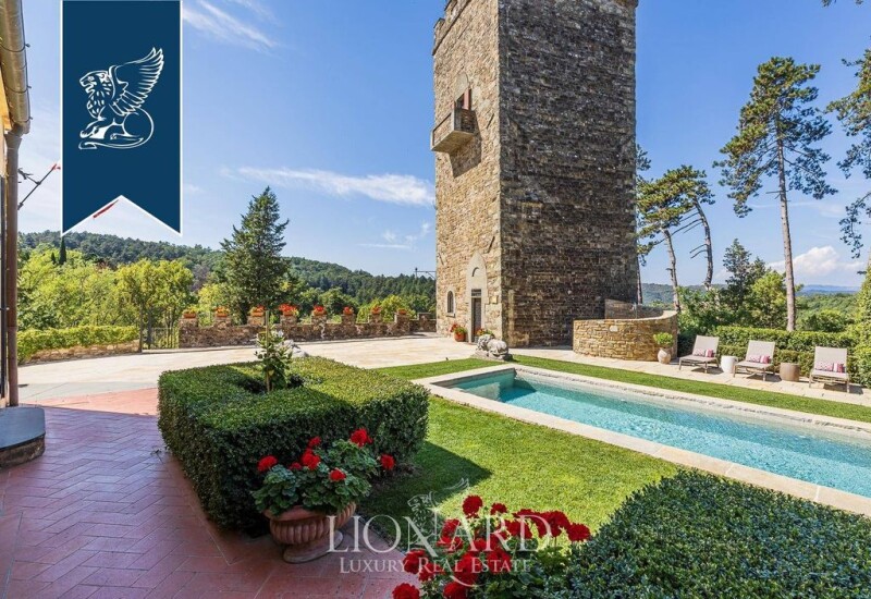 This stunning 650-sqm luxury villa with a 13th-century is for sale near Florence. The luxurious two-story main villa features a foyer with a fireplace, a big living room with a bar and a dining room overlooking a gazebo. The rear hall leads to a well-equipped kitchen, a bathroom and a staircase to the upper floor. The kitchen adjoins a breakfast room + home office with arched glass doors leading to a forest terrace and second patio. The grand staircase leads to the upper floor foyer, a primary bedroom with a newly constructed luxurious en-suite bathroom, new designer hall bathroom, and three additional bedrooms. The scenic medieval tower adjacent to the villa has five floors of furnished living and sleeping areas and a lower-ground floor housing a laundry room and ample storage areas. On the top floor there is a rooftop terrace with a panoramic view over the surroundings. The property's beautiful 2-hectare park houses a marvelous newly-built heated swimming pool, a splendid outdoor shower made of stone, with a spectacular spiral wall. The stone piazza of 150 sqm is the perfect entertaining space to host large seated dinners, receptions and doubles as a dance floor. Various relaxation areas and a gazebo complete the outdoor spaces. The double garage and big car park offer even more added value to this magnificent property for sale. Ref: 0963.