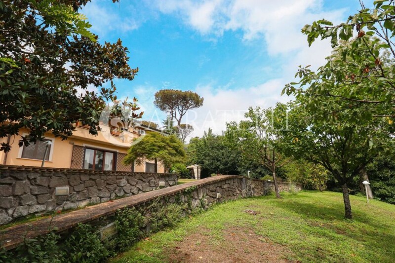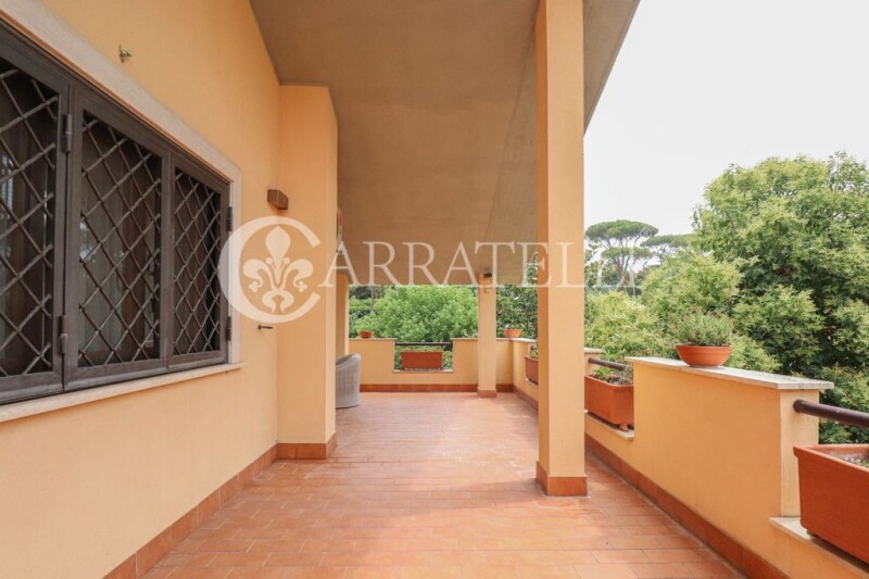 For sale the bare ownership of a delightful Villa surrounded by greenery of about 300 sqm, interior plus 1000 sqm of garden, with large bright windows and level finishes. Location The property boasts a privileged location within an elegant area in Via di Casal Lumbroso, just 20 minutes from the Historic Center of Rome, and 18 km from Leonardo da Vinci International Airport. Description The property consists of double entrance hall, representative living room with a central fireplace and dining room with a large terrace overlooking the private garden of about 1000 sqm, a fully equipped eat-in kitchen with access to the outdoor patio, The sleeping area includes two double bedrooms one of which with double vestier and a bathroom, upstairs a master bedroom with an open view a comfortable hobby room, with gym and study and a designer fireplace, bathroom and a fourth bedroom. Condition and Finishes The property is located within an elegant estate. The property has been completely renovated and maintained; the interiors feature spacious rooms and high-quality oak parquet floors. The bathroom walls are partly marble and ceramic, the fixtures are elegant and of high quality, and the systems are in working order. It will be delivered with most of the furnishings, including full kitchen and hot/cold air conditioning system. The lighting has been carefully maintained, the doors are partly in fine wood and partly with classy Murano inlays, and there is a fully equipped laundry room. The property is completed by a service apartment consisting of a kitchen, living room, and two double bedrooms with one bathroom. a double garage and an outdoor parking space. Potential uses The apartment lends itself to use as an investment, as only bare ownership is being sold.